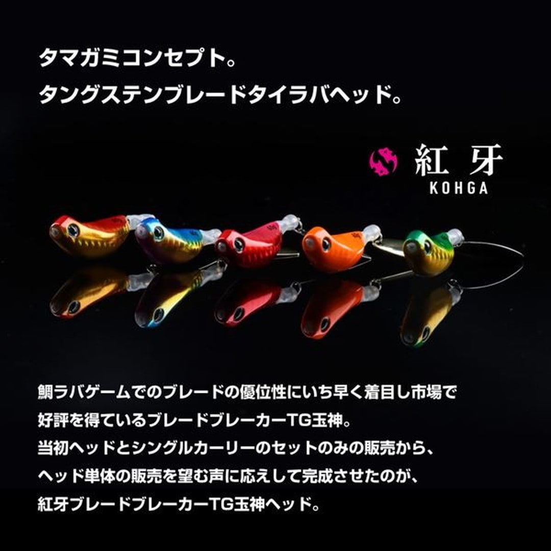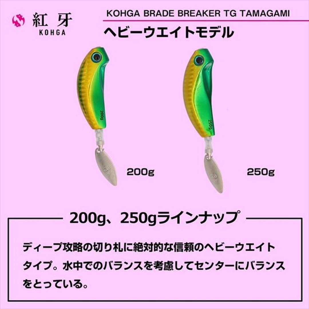 タマガミコンセプト。鯛ラバゲームでのブレードの優位性にいち早く着目し市場で好評を得ているブレードブレーカーTG玉神。当初ヘッドとシングルカーリーのセットのみの販売から、ヘッド単体の販売を望む声にお応えして完成させたのが、紅牙ブレードブレーカーTG玉神ヘッド。特にヘッドは250gまでのヘビーウエイトモデルをラインナップ。よりディープを攻略するためのブレードヘッドを目指して完成させた。中井一誠氏が提唱する、タマガミコンセプト対応のブレード付きタイラバヘッド。45gから250gまでの豊富なラインナップでシャローからディープエリアまで対応。中井一誠氏は、自身の釣り船海竜で真鯛はもちろん、アマダイのガイドも多く行っている。そんな彼が厳選した3色は、アマダイに特化したチューンナップモデル。