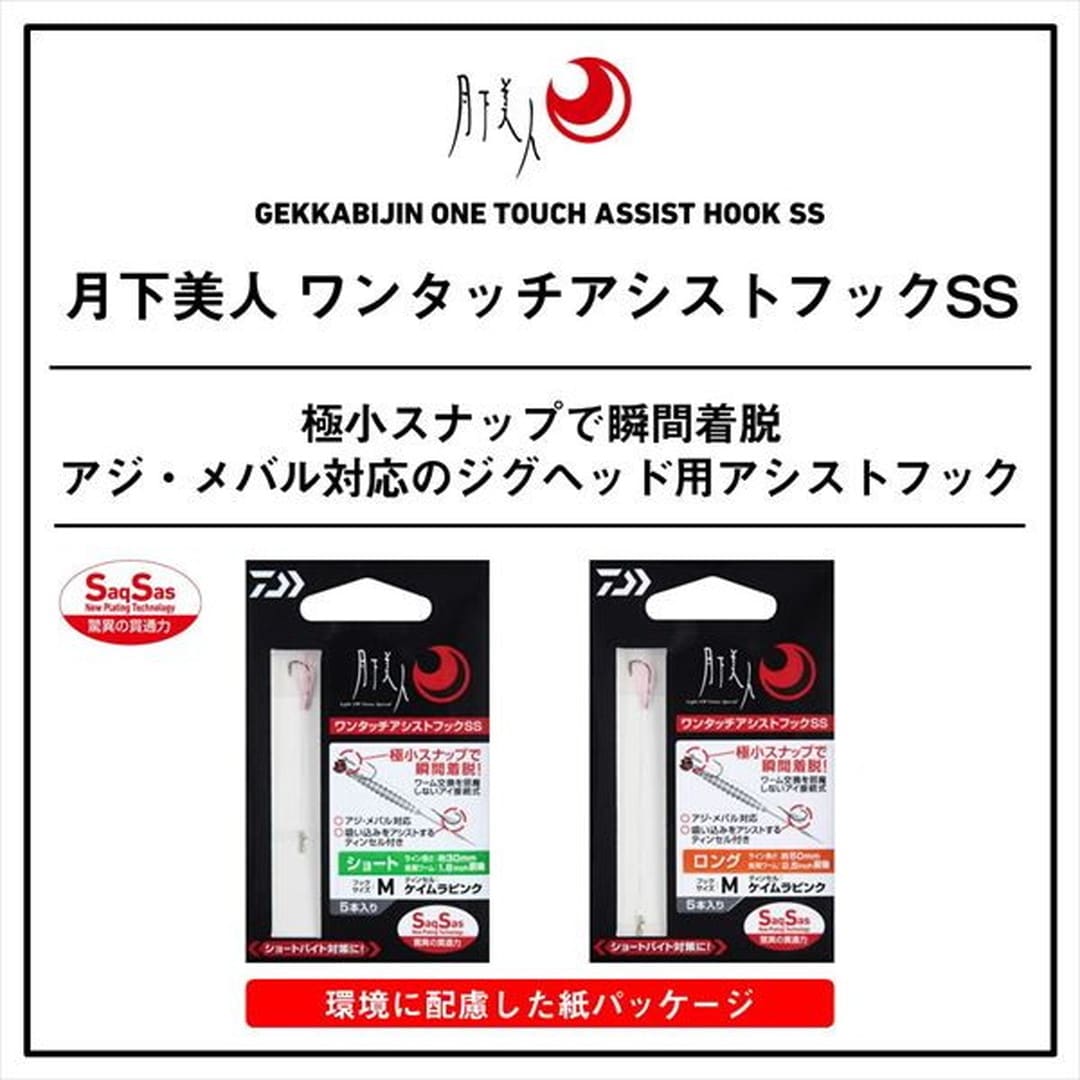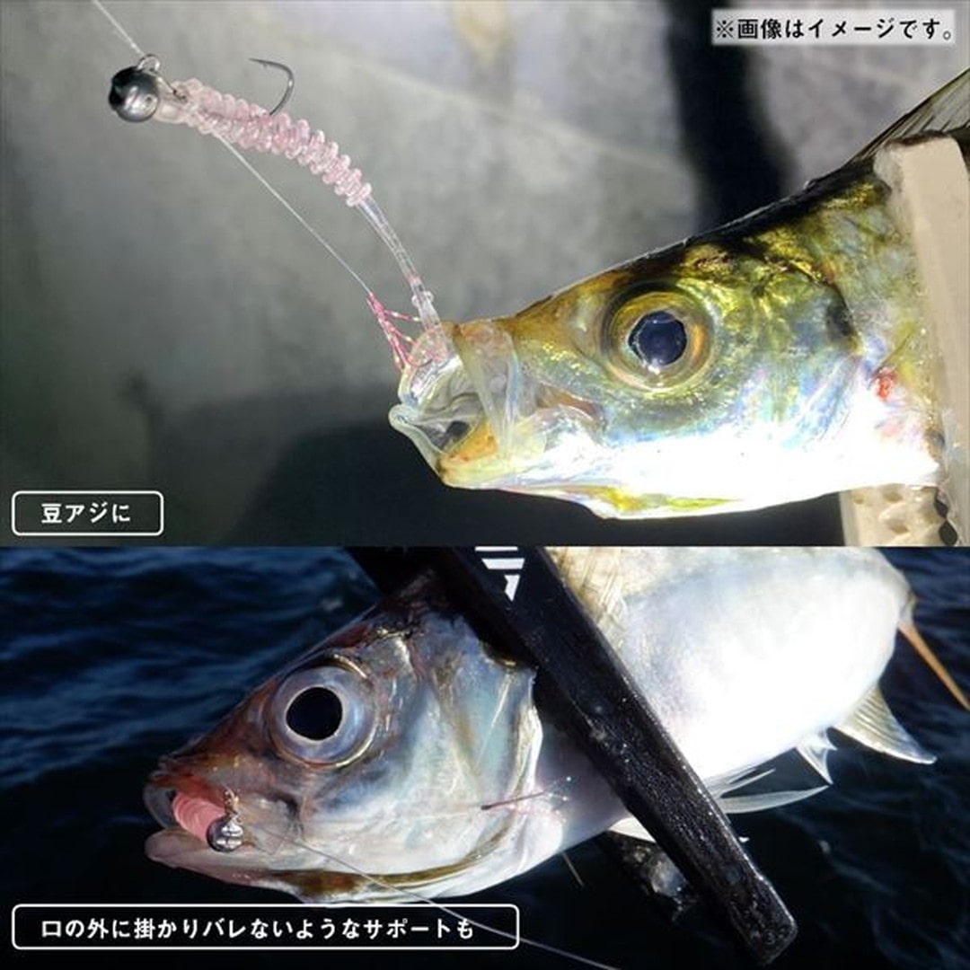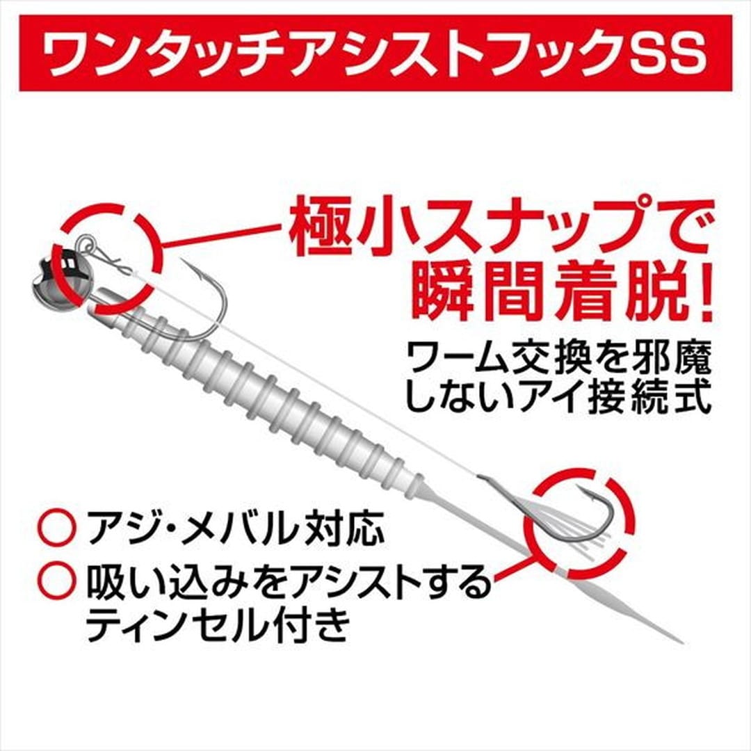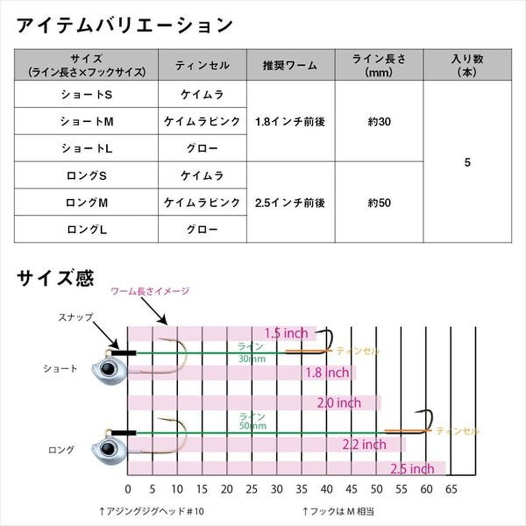 極小スナップで瞬間着脱!アジ・メバル対応のジグヘッド用アシストフック。アジ・メバルのショートバイト対策として最適なアシストフック。極小スナップをジグヘッドのアイに取り付けるだけなので、付けたままでもワーム交換が可能。1.8inch前後のワームに適合するショートと、2.5inch前後のワームに対応するロングをラインアップ。