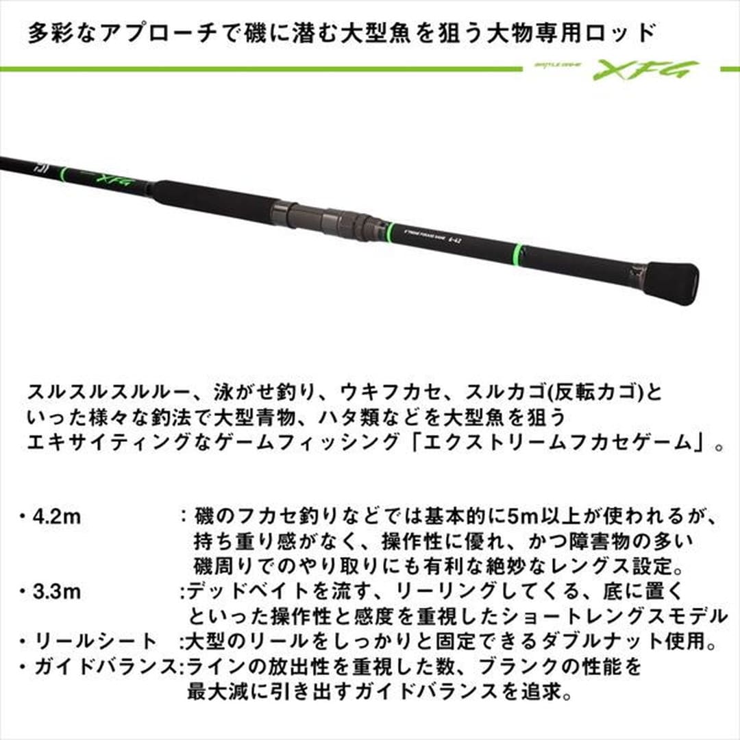 多彩なアプローチで磯に潜む大型魚を狙う 大物専用ロッド。するするスルルー、泳がせ、ウキフカセといった様々な釣法で大型青物、ハタ類などを大型魚を狙うエキサイティングなゲームフィッシング「エクストリームフカセゲーム」。磯の中層を悠々と泳ぎ回る大型魚を多彩な釣法で狙う為に開発された、これまでのフカセ竿とは一線を画す新コンセプト磯大物専用ロッド。素早く腰当てファイトに持ち込める取り回しの良いリールシート位置設定、大型魚とのファイトに安定感をもたらす楕円形状のフォアグリップ、太糸の捌きが良い大口径ガイドを採用。竿全体が粘り強く曲がり込み、大型魚の強烈な引きを耐えきり、魚がひるめば驚異的な反発力で大型魚を一気に浮かせにかかる。大型魚との熾烈なファイトを制し、夢のビッグフィッシュをその手に。