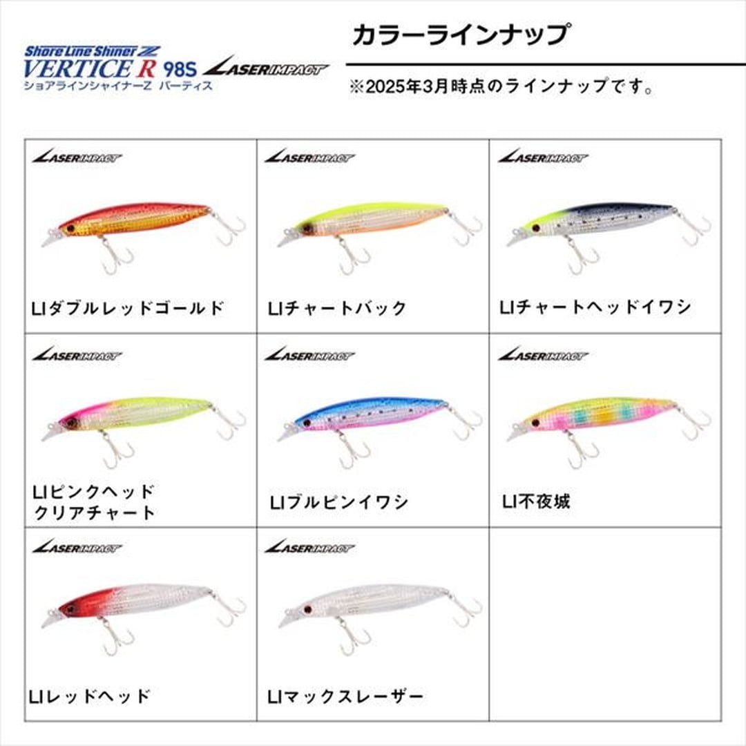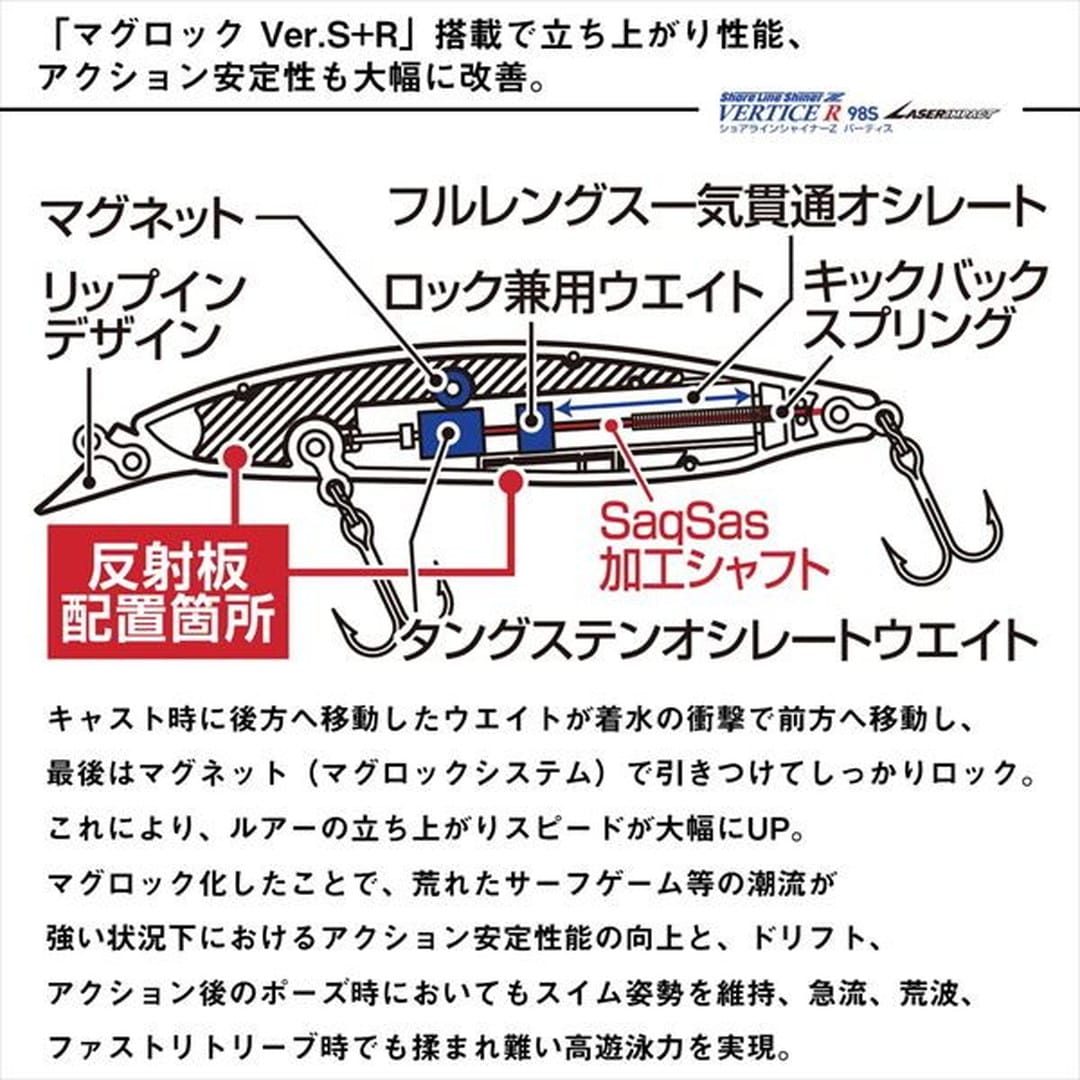 飛びの伝説を引き継いだSLZバーティスRに、レーザーインパクト搭載モデルが登場!「この輝きには釣れる理論(ワケ)がある。」レーザーインパクト(PAT P)搭載。レーザーインパクトは、3Dマルチ反射構造により「イワシ」等と同じ高輝度反射光を多方向に放ち、「本物の誘いを遠くまで」を実現。更に、泳いでいる時の反射光の明滅まで再現!夜間や日陰のわずかな光でもベイトフィッシュと同様、昼夜、場所を問わず光でターゲットにアピール。■98S・・・河川、足場の悪いエリア、ボートゲームに特化したスローシンキングチューンモデル。