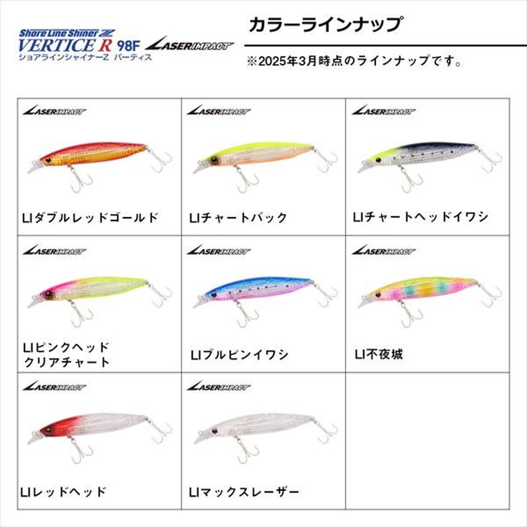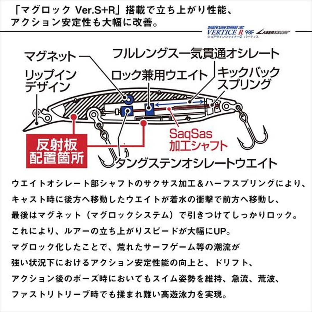 飛びの伝説を引き継いだSLZバーティスRに、レーザーインパクト搭載モデルが登場!「この輝きには釣れる理論(ワケ)がある。」レーザーインパクト(PAT P)搭載。レーザーインパクトは、3Dマルチ反射構造により「イワシ」等と同じ高輝度反射光を多方向に放ち、「本物の誘いを遠くまで」を実現。更に、泳いでいる時の反射光の明滅まで再現!夜間や日陰のわずかな光でもベイトフィッシュと同様、昼夜、場所を問わず光でターゲットにアピール。■98F・・・河川、河口、港湾部をメインフィールドに想定したコンパクトサイズフローティングミノー