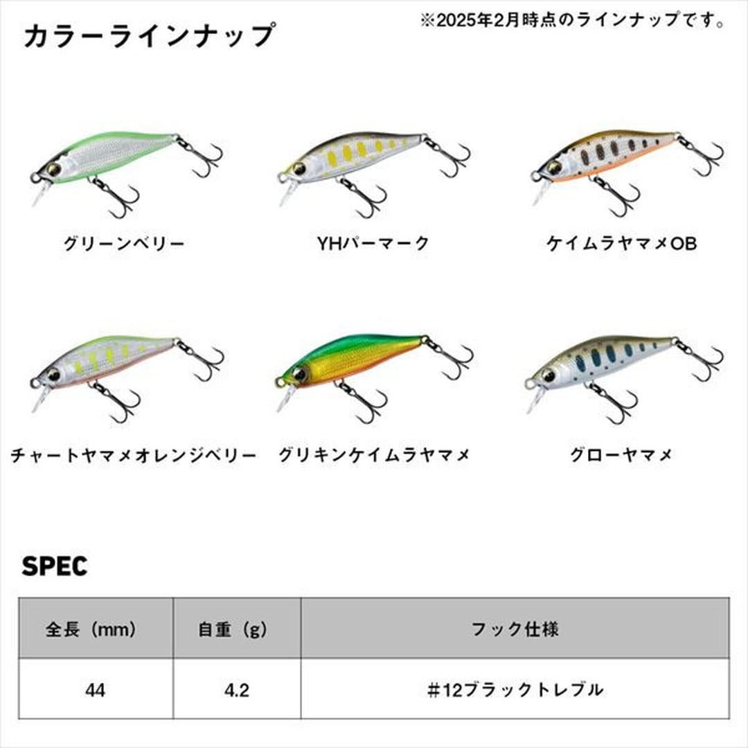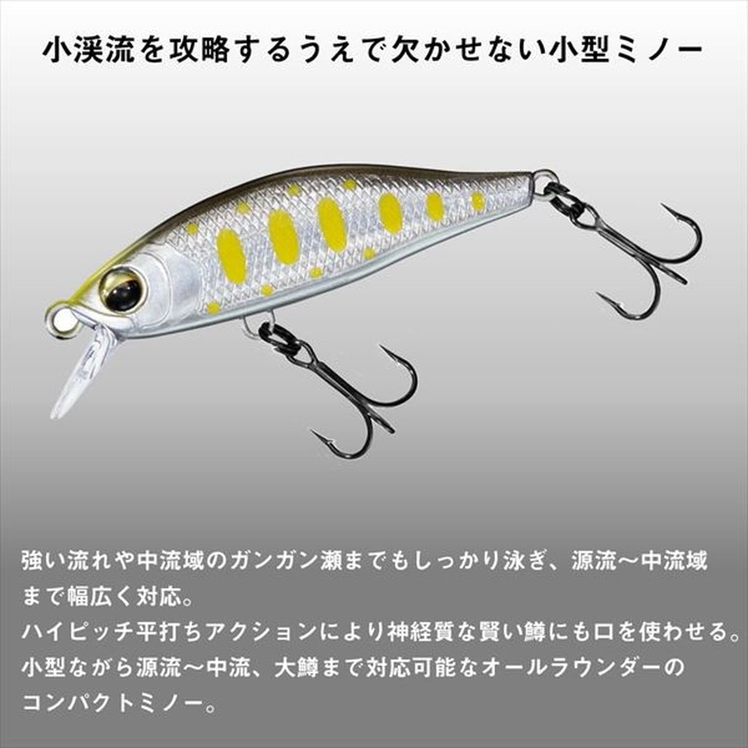基本性能を徹底的に研ぎ澄ませたハイパフォーマンスミノー◆44S・・・強い流れや中流域のガンガン瀬までもしっかり泳ぎ、源流~中流域まで幅広く対応。ハイピッチ平打ちアクションにより神経質な賢い鱒にも口を使わせる。小型ながら源流~中流、大鱒まで対応可能なオールラウンダーのコンパクトミノー。魚に違和感を与えない柔らかな光の反射をするアルミ貼り。熟練の職人が1枚1枚貼るMADE IN JAPANクオリティ。