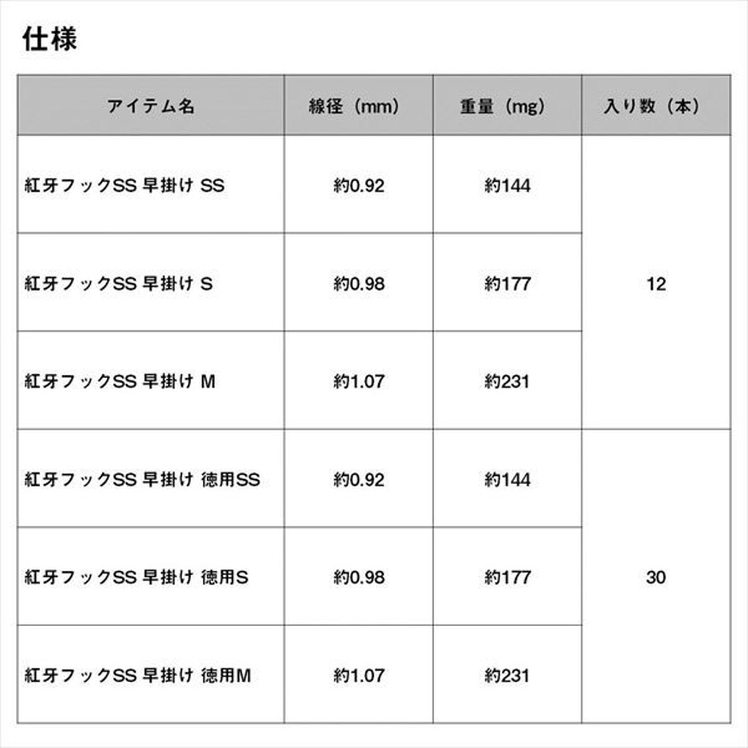 強靭&軽量な早掛けタイプのタイラバ用フック。掛かりが早いストレートポイント形状で、ショートバイトが多い時に有効。通常タイプの紅牙フックに比べると同サイズ感では細軸だが、しっかり平打ちされており強度は十分。軽い為吸い込み性も高い。