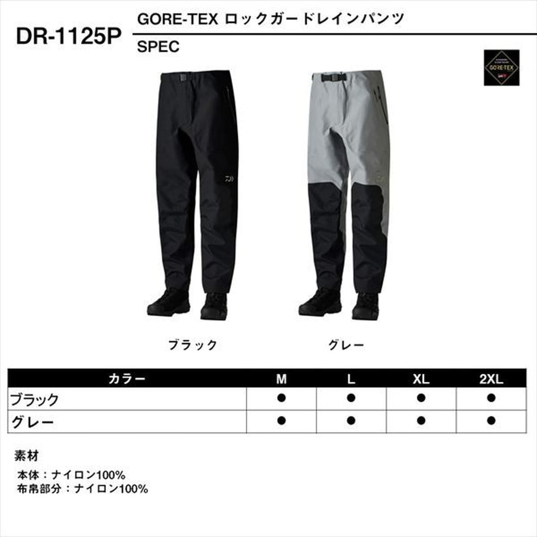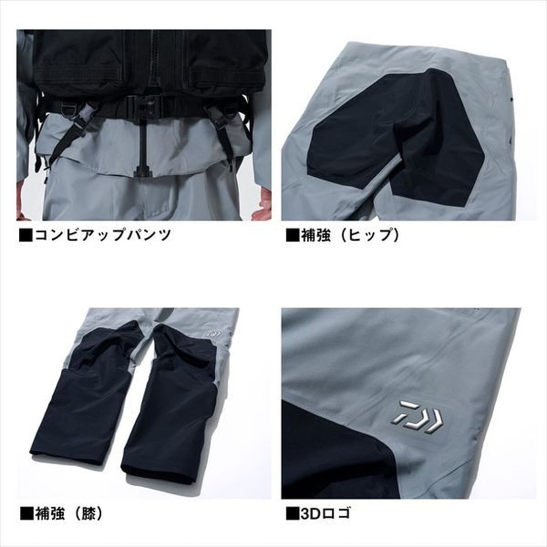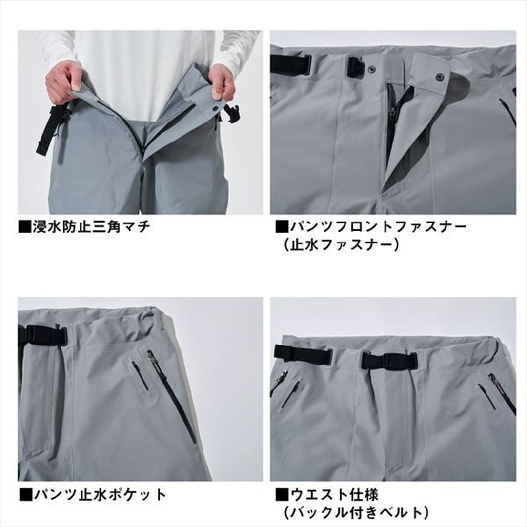 磯ルアー向け!ハードな環境に耐えうるレインパンツ。表地は磯場での使用を想定した生地厚のGORE-TEX Productsの3層素材を採用。環境負荷の少ないフッ素フリー撥水剤を使用したモデル。なかでも強度が必要なヒップ、膝、裾は耐久性の高い150デニールのGORE-TEX PROファブリクスの厚手生地を使用。レインパンツとゲームべストを接続できるパンツコンビアップシステムにより股ベルトの接続が容易になり、突っ張らずに足を動かしやすい。ウエスト部はバックル付きベルトを採用し、ずり落ちにくく、調整しやすい仕様。