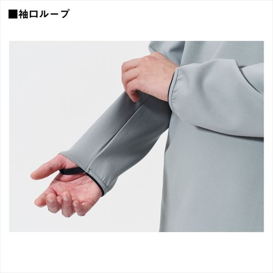 突っ張らず動きやすい微起毛シャツ。肌面に微起毛を配した柔らかい手触りのフーディーシャツ。ストレッチ性に優れているため、身体にフィットし、動きやすい。冷気の侵入を防ぐネックウォーマーが一体型となった仕様。寒い日はもちろん、冬場でも日差しが気になるときに便利。袖口はバインダー仕様で袖捲りしやすい。袖口は親指を通せるフィンガーホールつき。その他機能
