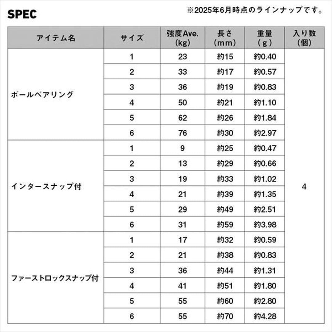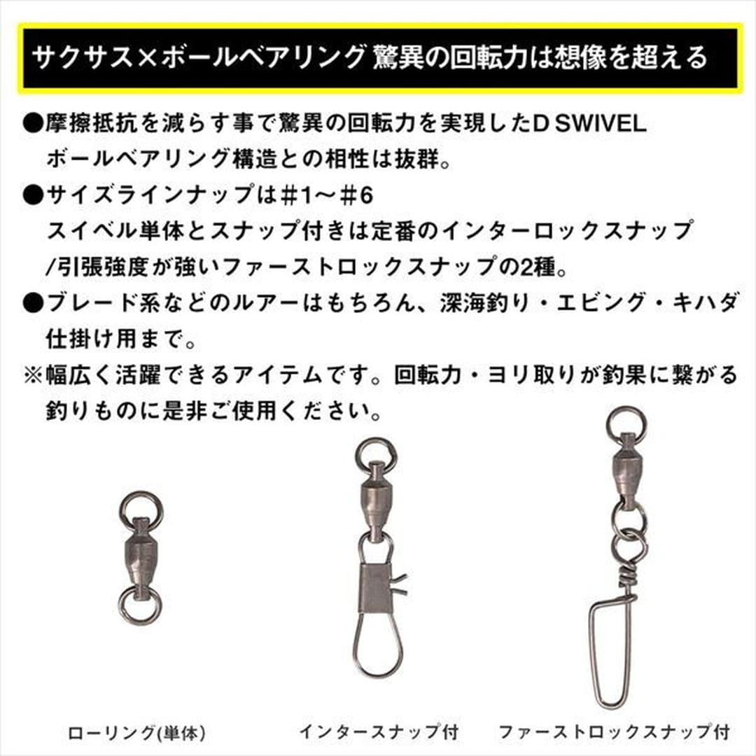 D SWIVEL SS(サクサス)にボールベアリングが登場!摩擦抵抗を減らす事で驚異の回転力を実現したD SWIVEL。ボールベアリング構造との相性は抜群で回転力抜群のスイベルが完成。サイズラインナップは#1~#6。スイベル単体とスナップ付きは定番のインターロックスナップ/引張強度が強いファーストロックスナップの2種。ブレード系などのルアーはもちろん、深海釣り・エビング・キハダ仕掛け用まで、幅広く活躍できるアイテム。回転力・ヨリ取りが釣果に繋がる釣りものに是非。