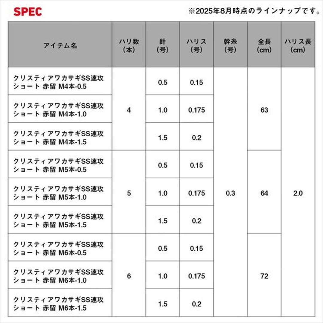 久保田テスター監修の速攻シリーズに新シリーズの追加。◆市場で絶大な支持を得る「赤留」はシチュエーションを選ばずシーズン初期~氷上まで人気の高い留め色 ◆2024年に発売したショート夜光留と同じく、取り回しがしやすい4本針からラインナップ ◆サクサス+赤留。驚異の貫通力Saqsasに赤留を合わせたアピール抜群の仕掛。針色がグレーの為、赤留の色が濃くなりシルエットが強くなる。◆スペクトロン制覇(ナイロン)糸使用。しなやかで適度な張りのあるスペクトロン制覇を使用。ワカサギに違和感を与えないナイロン糸。◆D-MAXワカサギ マルチ・・・キツネ形状をベースにワカサギの繊細なアタリを確実にとらえるための外だし針先を採用。