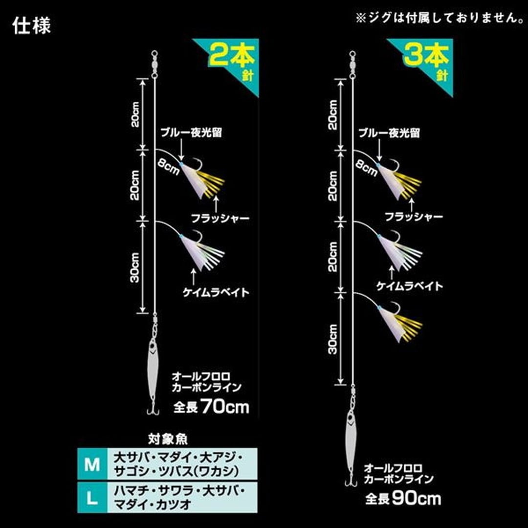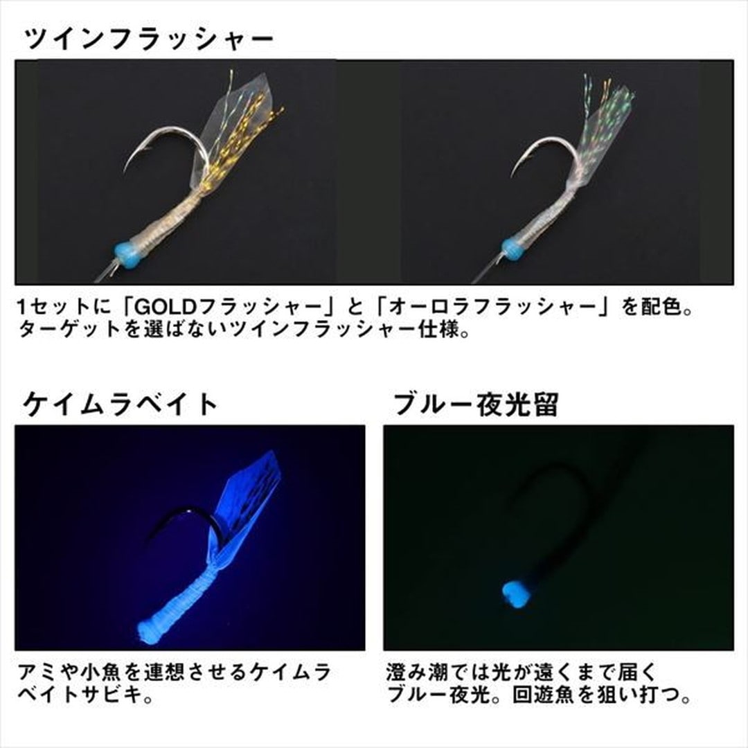 ジグの動き&サビキでターゲットに強烈アピール!ショアオフショア問わずどちらも使える万能スペック!すべてのパーツにこだわった納得の「釣れる!」設計! ■ツインフラッシャー。1セットに「GOLDフラッシャー」と「オーロラフラッシャー」を配色。ターゲットを選ばないツインフラッシャーサビキ仕様。■ケイムラベイト。アミや小魚を連想させるケイムラベイトサビキ。■ブルー夜光留。澄み潮では光りが遠くまで届くブルー夜光。回遊魚を狙い打つ! ※ジグは付属しておりません。