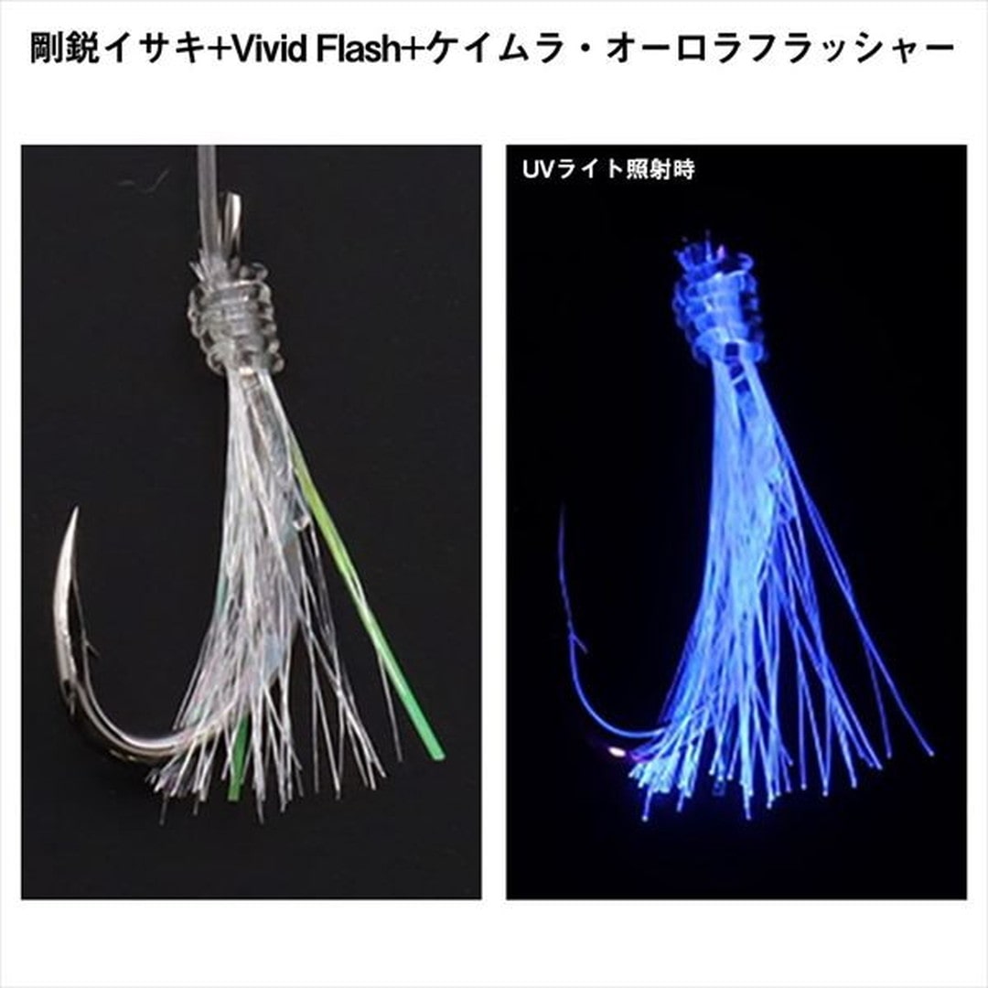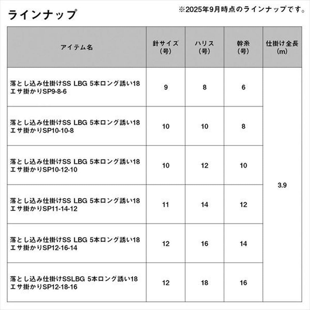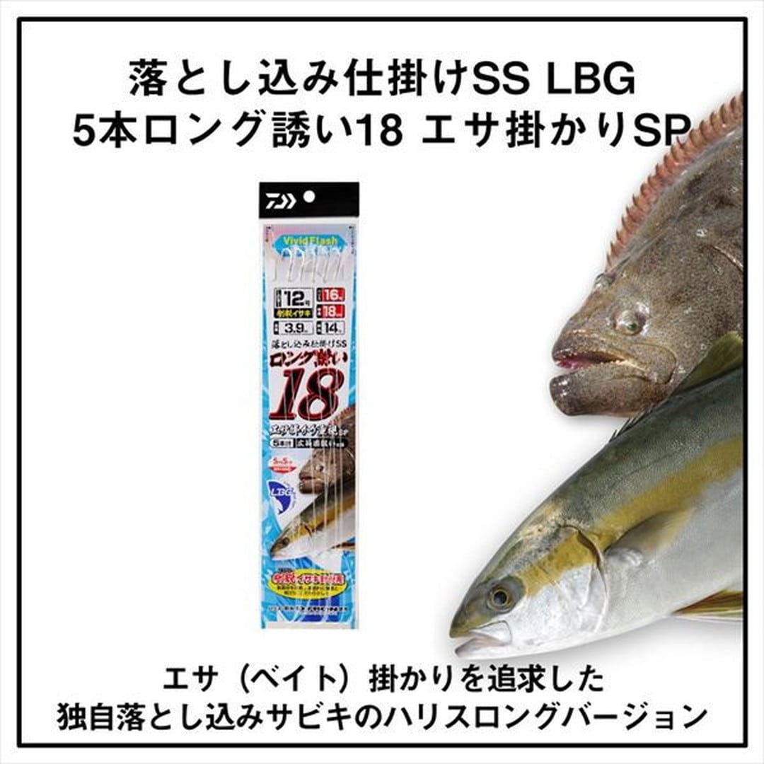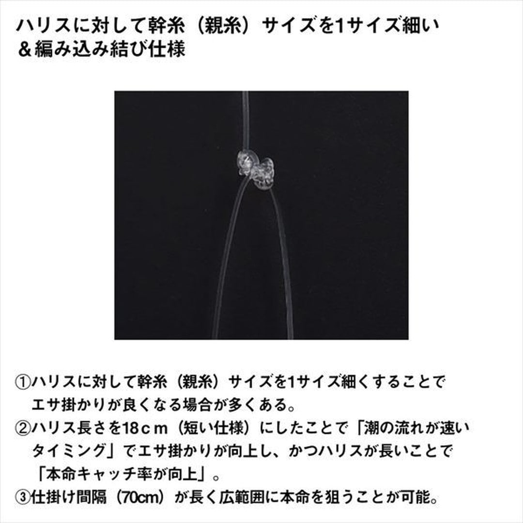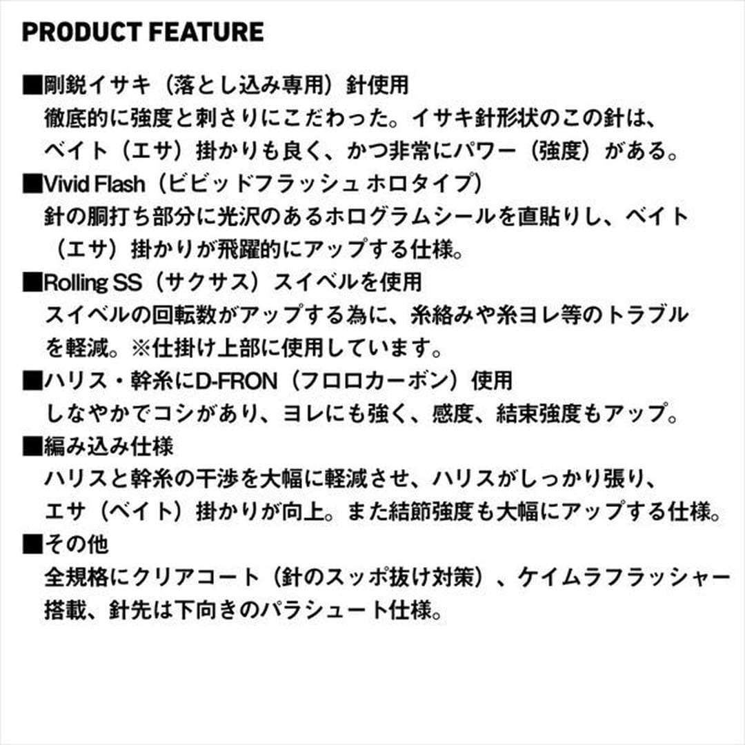 エサ(ベイト)掛かりを追求した独自落とし込みサビキ。ハリスに対して幹糸(親糸)サイズを1サイズ細くすることでエサ掛かりが良くなる場合が多くある。仕掛け間隔(75cm)が長く広範囲に本命を狙うことが可能に。剛鋭イサキ(落とし込み専用)針を使用。新素材を使用し、徹底的に強度と刺さりにこだわった。イサキ針形状のこの針は、ベイト(エサ)掛かりも良く、かつ非常にパワー(強度)がある。