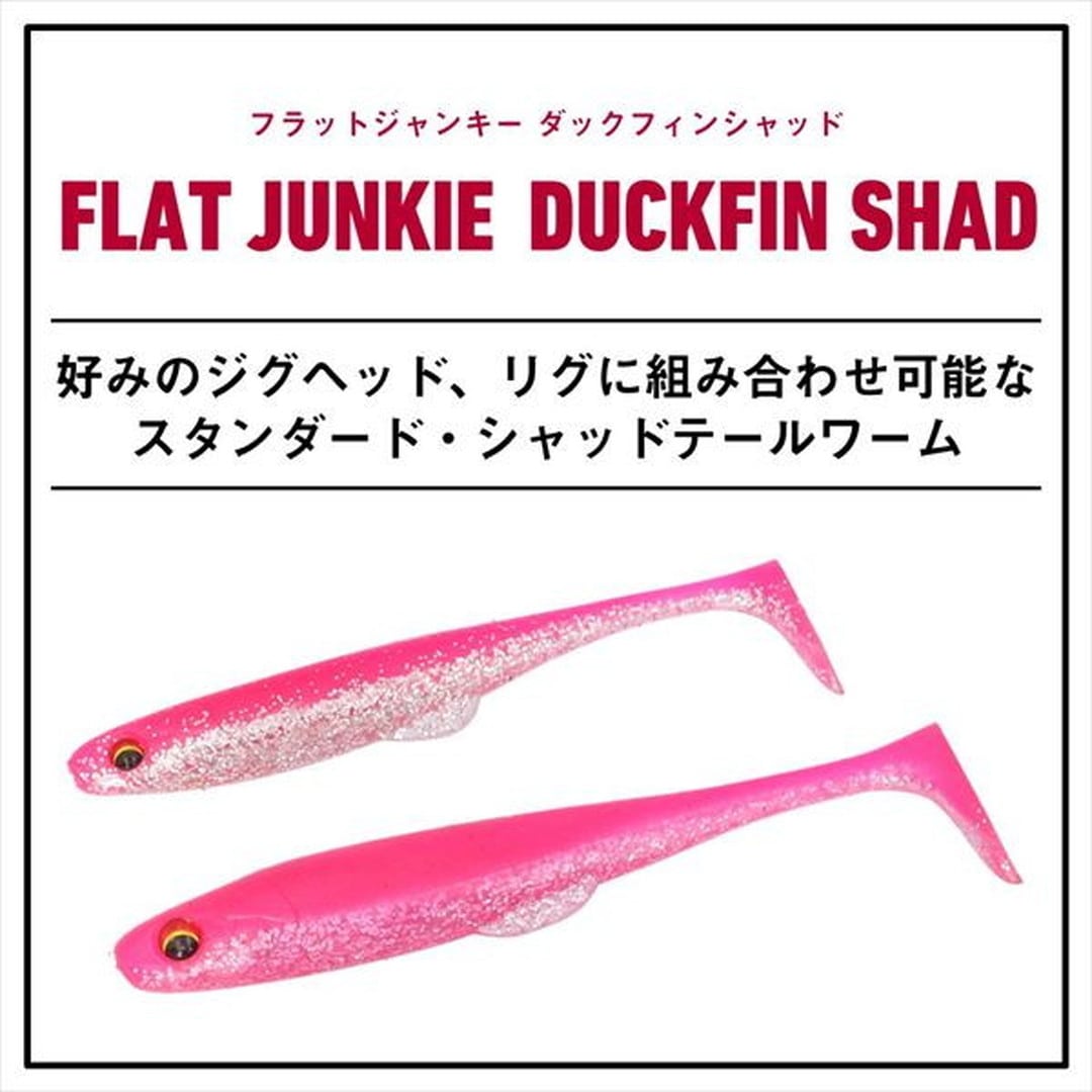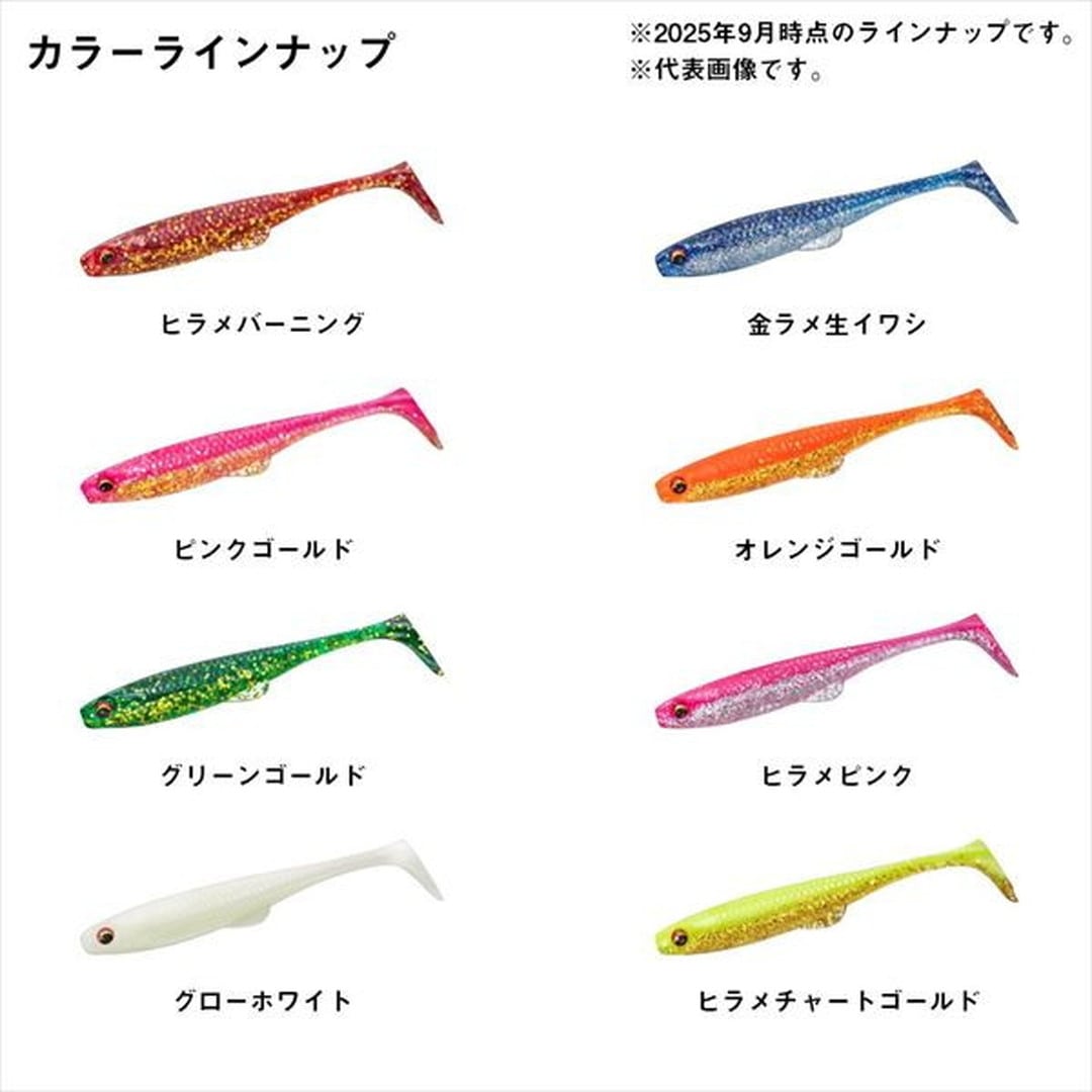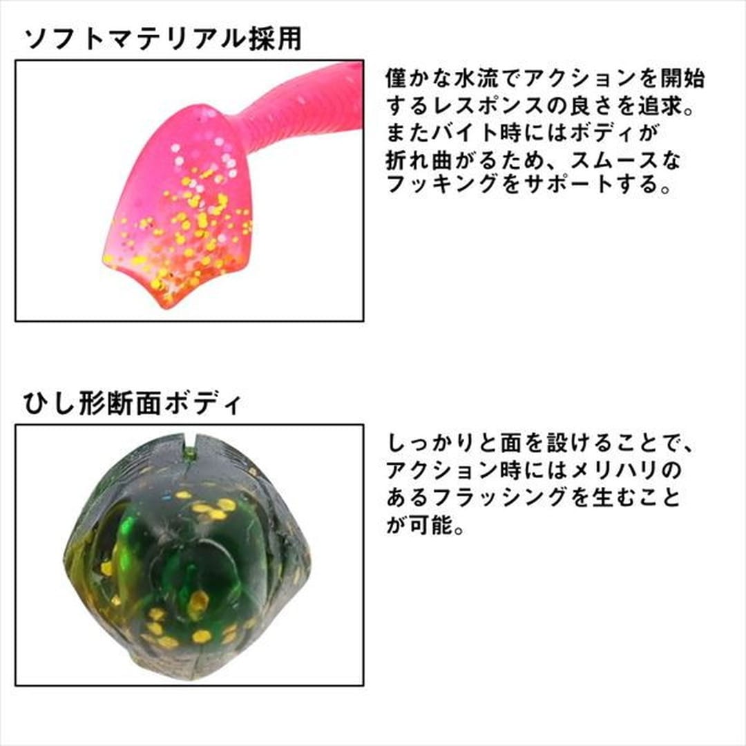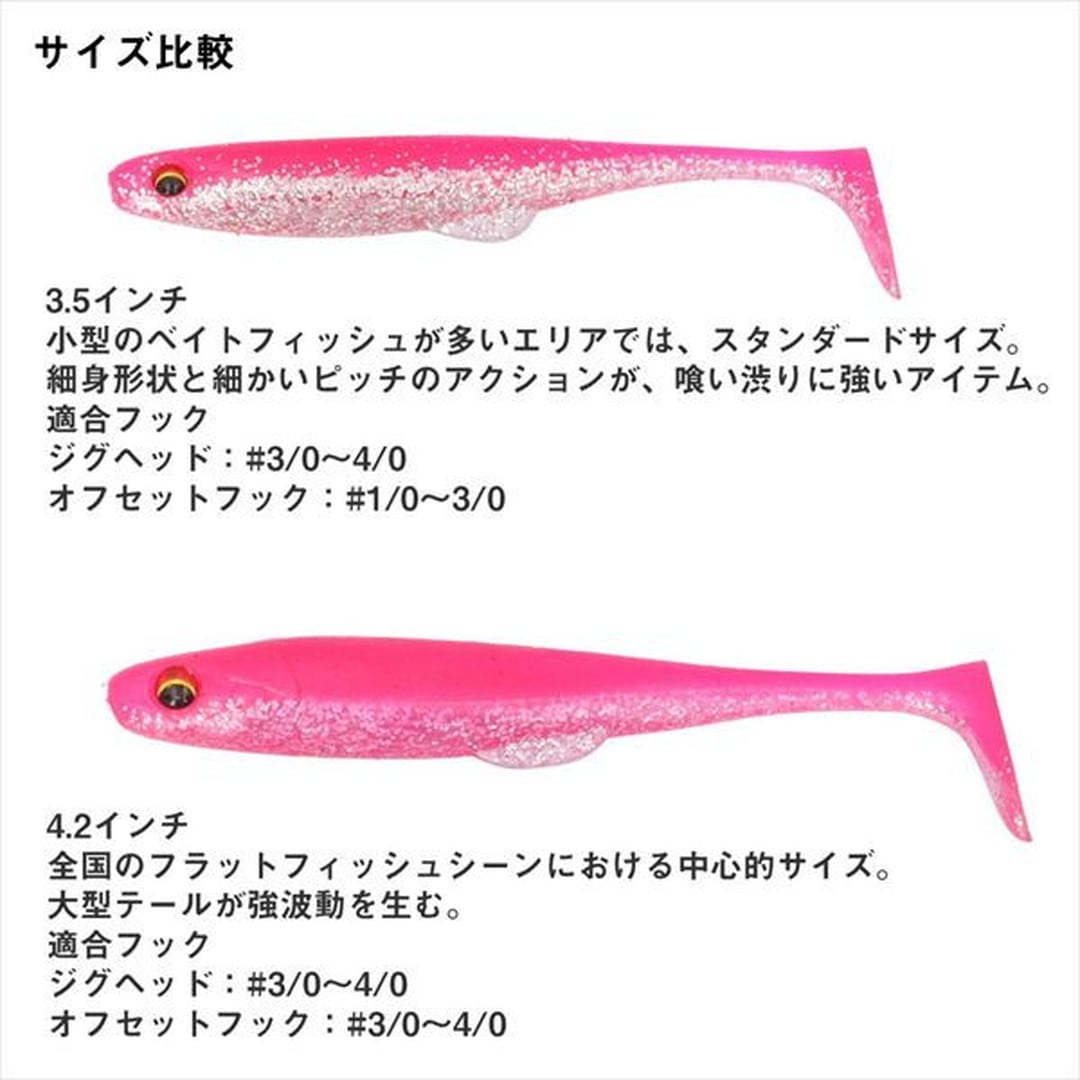 好みのジグヘッド、リグに組み合わせ可能なスタンダード・シャッドテールワーム目玉付きのリアルな外観はそのままに、多様化が進むリグへの対応力を強化。さらに、貴重なバイト時にボディが折れ曲がりやすいソフトマテリアルを採用し、スムーズなフッキングを実現した。ハイプレッシャー化が進むフィールドでも通用する実釣性能を高めた、現代のスタンダード・シャッドテールワームである。