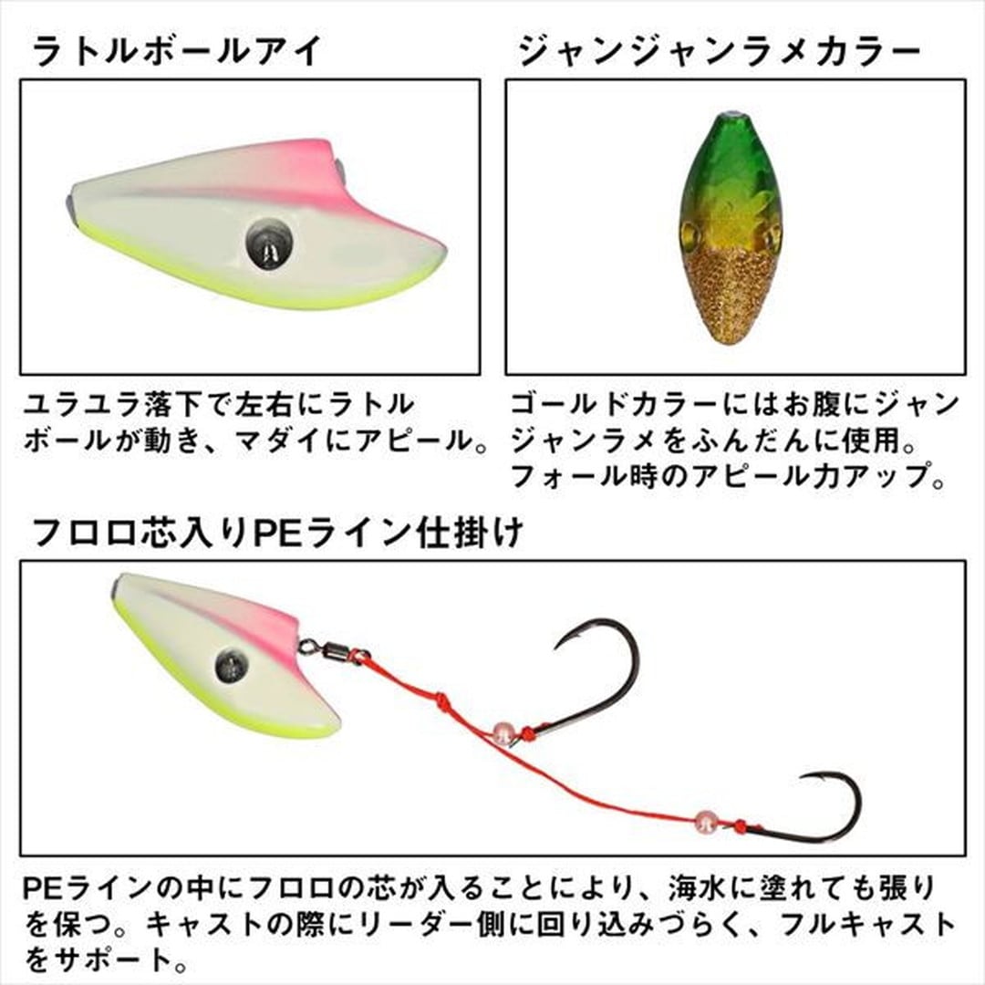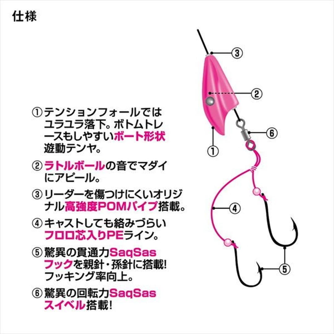 ユラユラフォールでマダイを誘う!!テンションフォールではユラユラ落下!ボトムトレースしやすいボート形状遊動テンヤがパワーアップして登場!ラトルボール音がマダイにアピールする。オリジナル高強度POMパイプ搭載でリーダーを傷つけにくい仕様に。また、キャストしても絡みづらいフロロ芯入りPEラインを採用。親針・孫針には驚異の貫通力サクサスフックを搭載したことでフッキング率がUP!そしてスイベルにも驚異の回転力サクサススイベルを搭載し糸ヨレが激減。