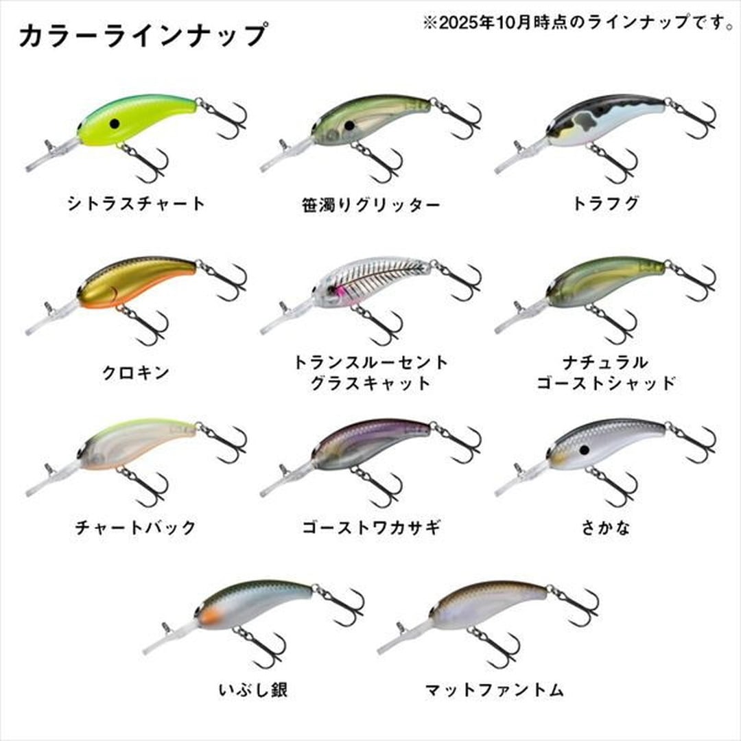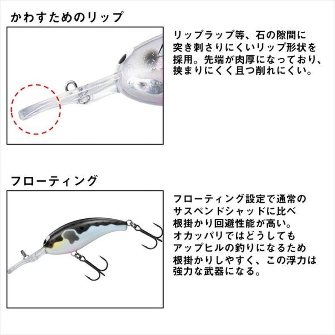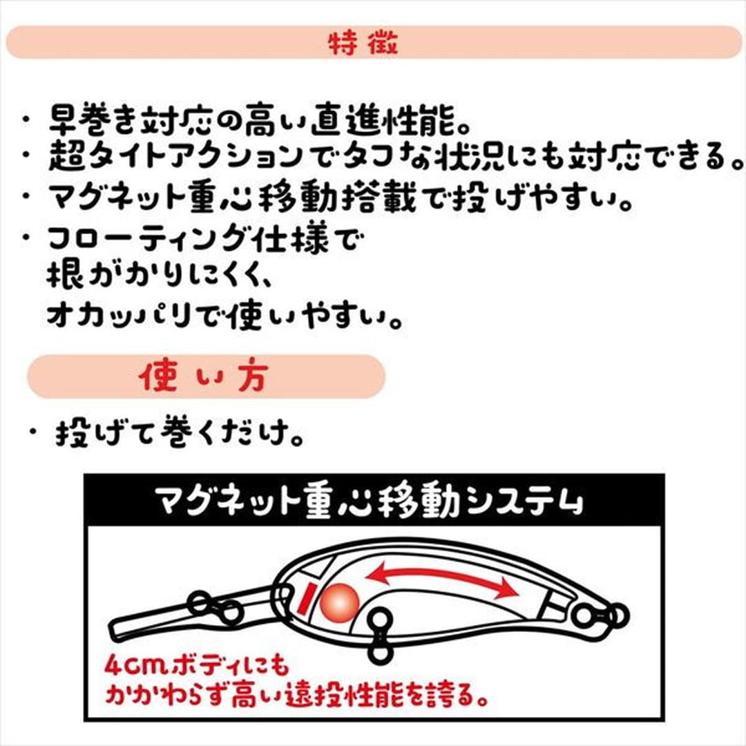 オカッパリ特化型フローティングシャッド!とにかくシンプルに投げて巻くだけのシャッドの釣りをオカッパリで楽しもうというコンセプトで開発した。一般的にシャッドといえばサスペンドをイメージするが、フローティングにすることでシャッドの弱点である根掛かりしやすさを改善させ、オカッパリで使いやすく仕上げている。ハイフロートと言えるほどの浮力設定でオカッパリでは強力な武器となるはずだ。重心移動にはマグネット重心移動システムを搭載。フローティングでありながら高い遠投性能を誇る。かわいい見た目でありながら高い戦闘能力を持ったシャッドに仕上がっている。