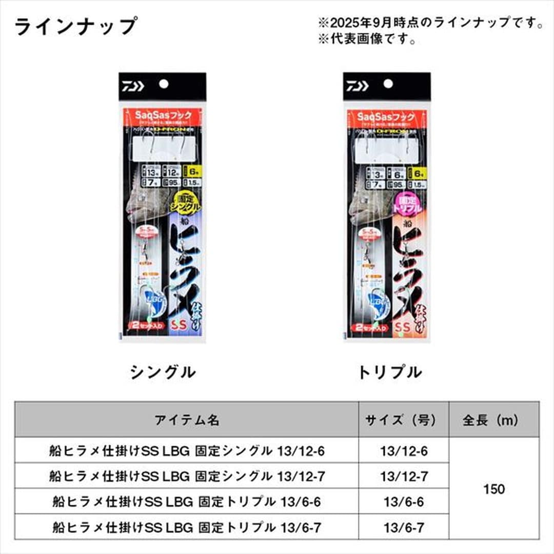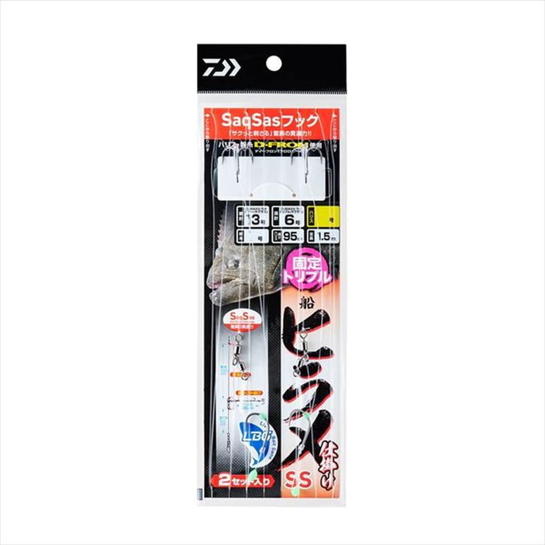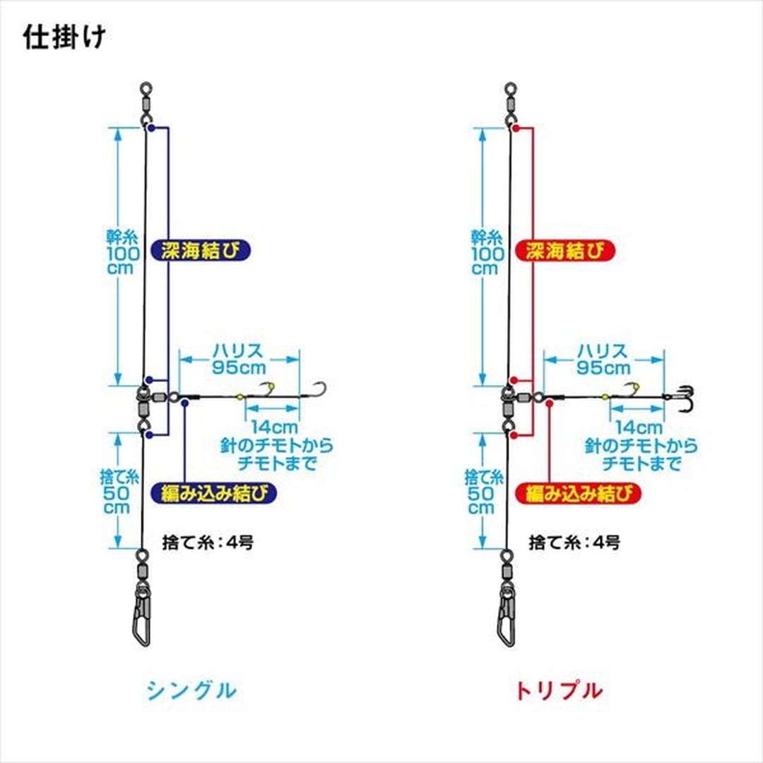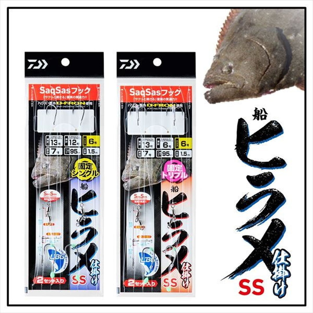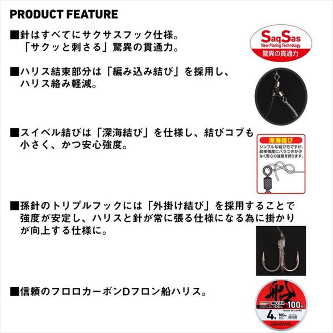 元祖サクサス仕様ヒラメ仕掛けの復刻版が遂に登場!!2013年リリースの快適ヒラメ仕掛SSの復刻版仕掛け。針はすべてにサクサスフックを使用「サクッと刺さる」驚異の貫通力。ハリス結束部分は「編み込み結び」を採用し、ハリス絡み軽減。スイベル結びは「深海結び」を使用し、結びコブも小さく、かつ安心強度。孫針のトリプルフックには「外掛け結び」を採用することで強度が安定し、ハリスと針が常に張る仕様になる為に掛かりが向上。孫針シングル、トリプル共にハリス6号~7号の2サイズのラインアップ。