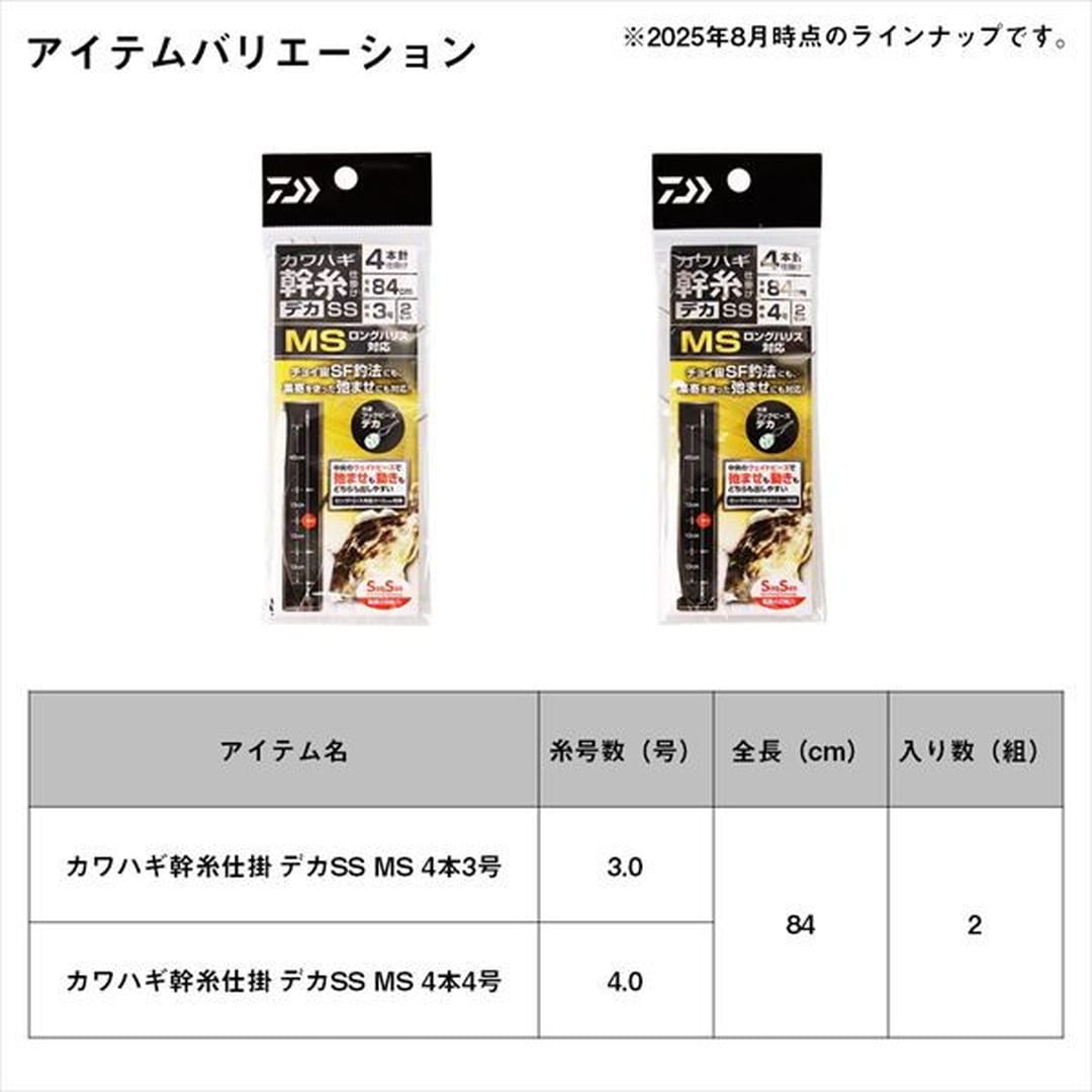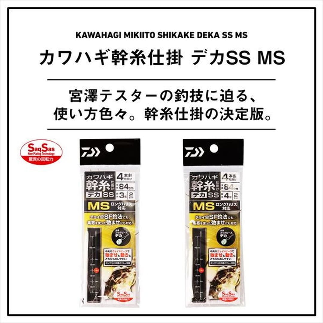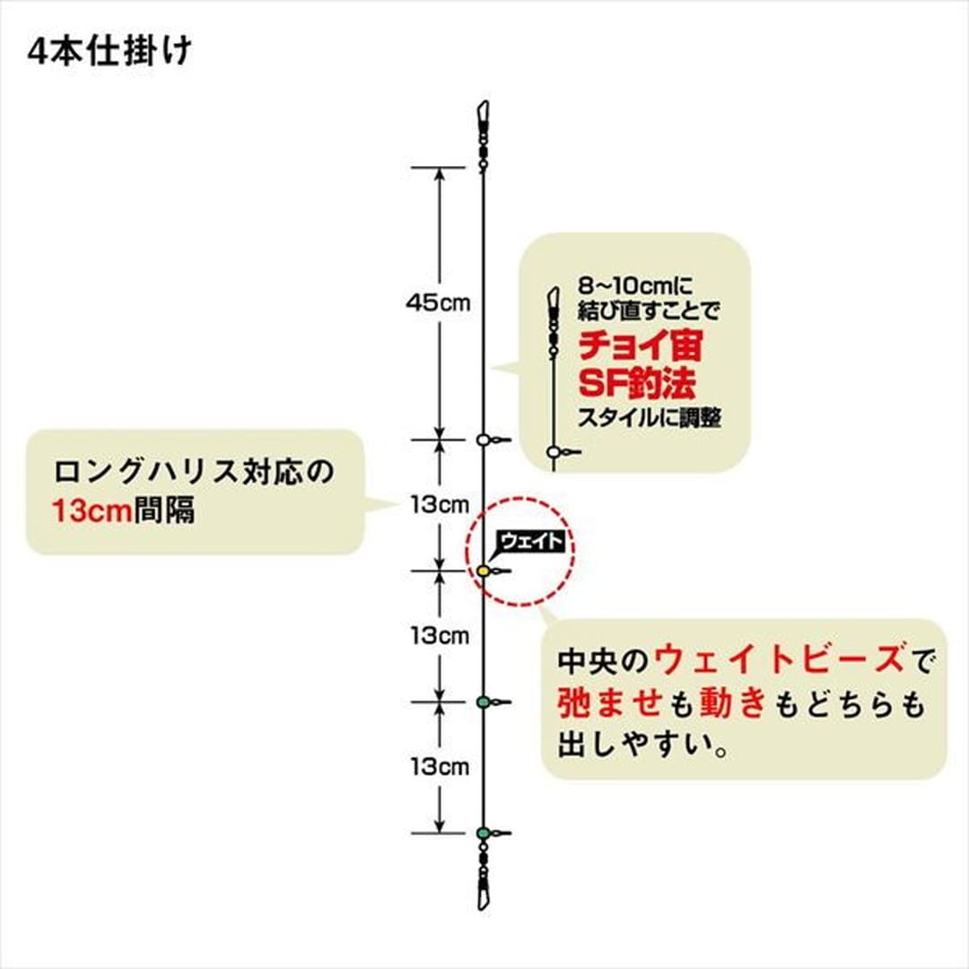 宮澤テスターの釣技に迫る!使い方色々。幹糸仕掛の決定版!4本仕掛となっており、宮澤テスターの代名詞とも言えるチョイ宙 SF釣法から集寄を使用した弛ませの釣りまで、様々なシチュエーションで使いこなす事ができる幹糸仕掛。また仕掛けの中央部に鉛製フックビーズを入れることで、弛ませもエサの動きも出しやすくなる。ロングハリスも対応の針間設定となっている。初期設定は 上糸間 45㎝ 集寄の釣りでしっかりと弛ませのストロークが取れる。状況に合わせて針の装着位置が変更可能なビーズ4個仕掛。◆下3本 → 魚が浮きにくい時の宙釣り ◆上3本 → 集寄を使った弛ませ系釣り