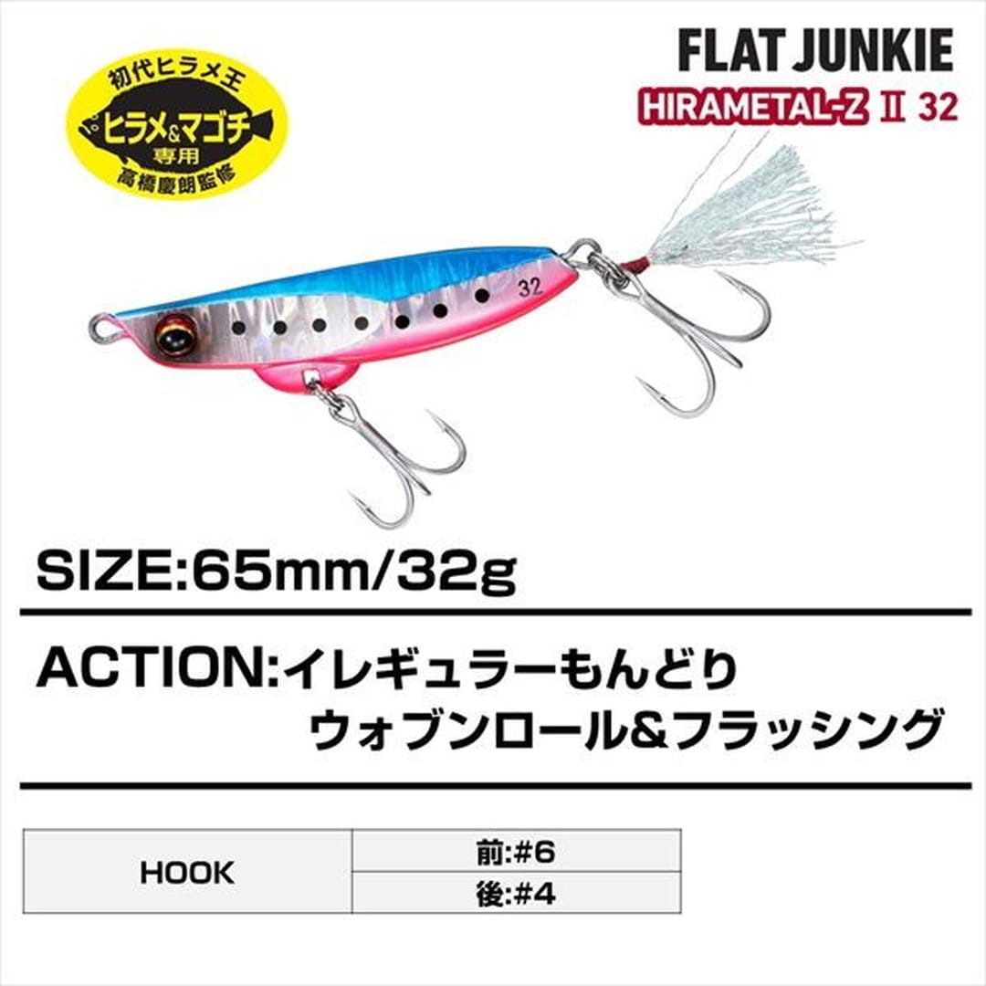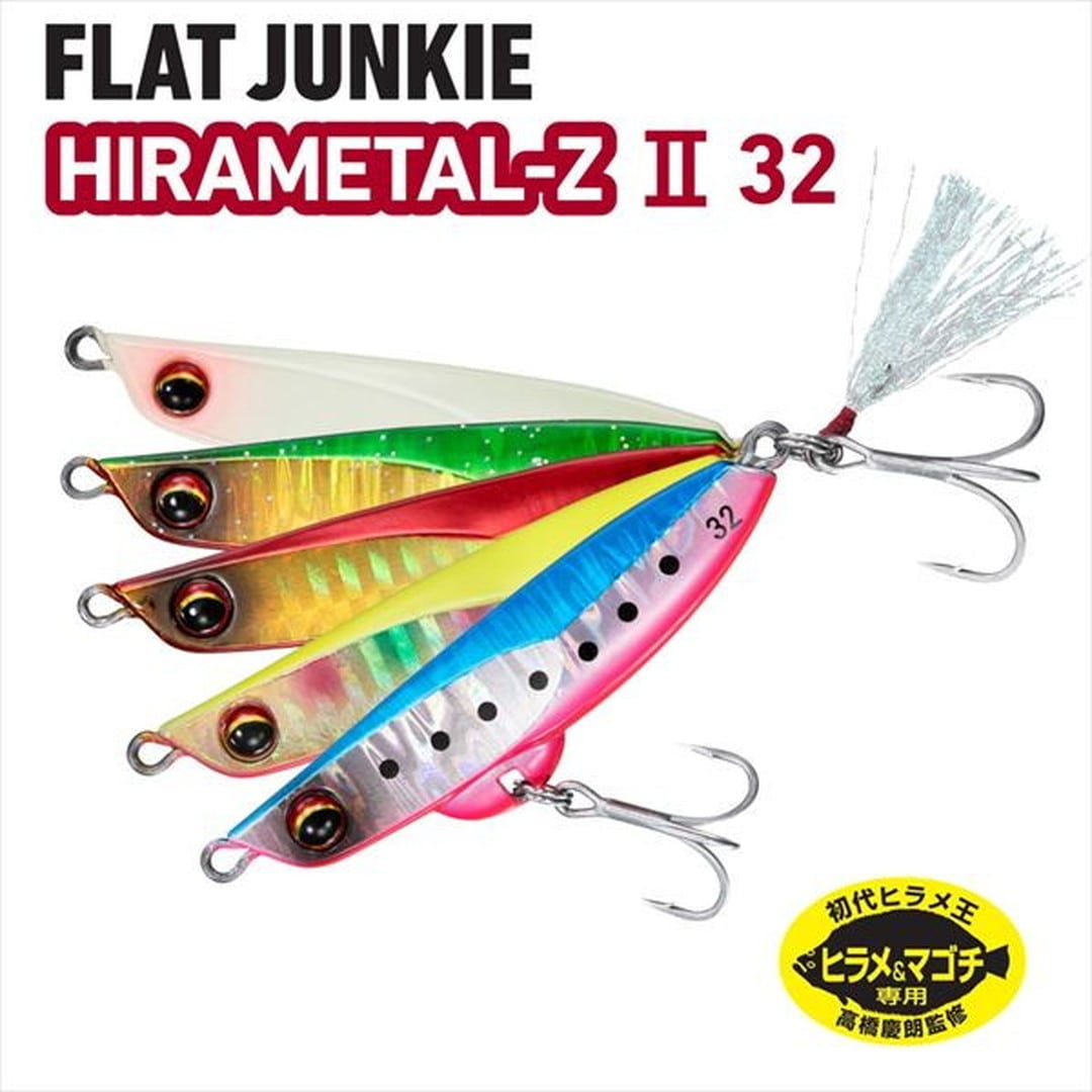 ヒラメ、マゴチ専用の悶絶アクション2フックメタルジグ「ヒラメタルZ」が、「ZII」の名を冠してブラッシュアップ!ヒラメ狙いのアングラーに贈るヒラメ&マゴチにターゲットを特化したフラットジャンキーシリーズ。プラグ、ワームでは攻めきれない「遠距離&ディープ」に潜むターゲットを狙うときに有効なサーフゲームの標準ウエイトモデル。ボディ延長&フックポジションリミッター改善により、1サイズ大型のフックが搭載可能に(フロント#6:リア#4)。これにより、波打ち際での攻防の際、座布団ヒラメなどの大型魚が引き波に持っていかれるときに発生する強い負荷で多発していたフック伸びによるバラしが激減。濁りに強い多面・高フラッシングデザインで広範囲にアピール。着脱可能バイトマーカーティンセルがリアクションバイトを誘発。