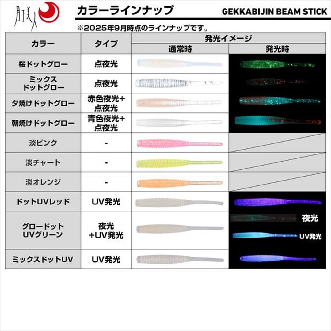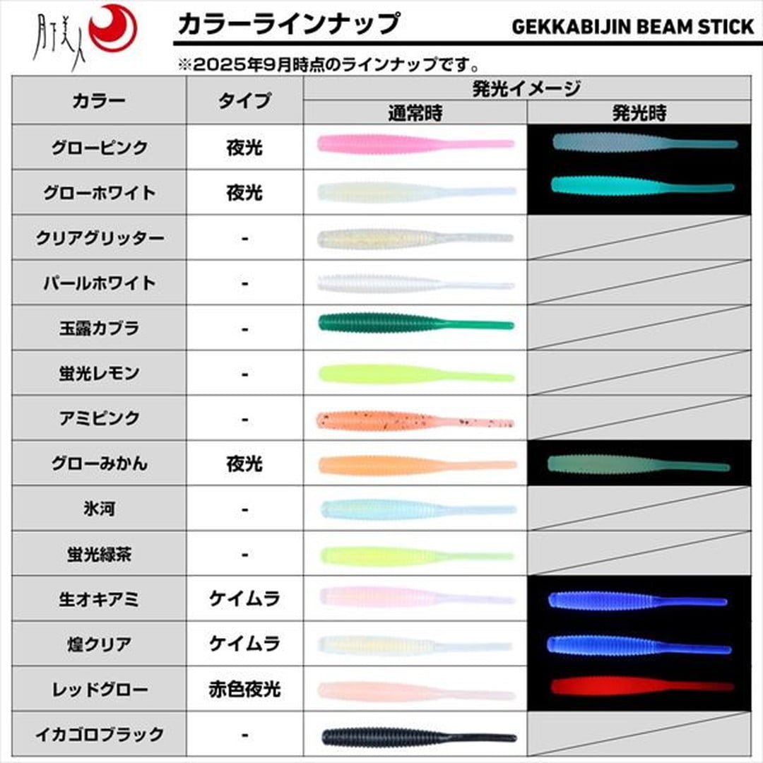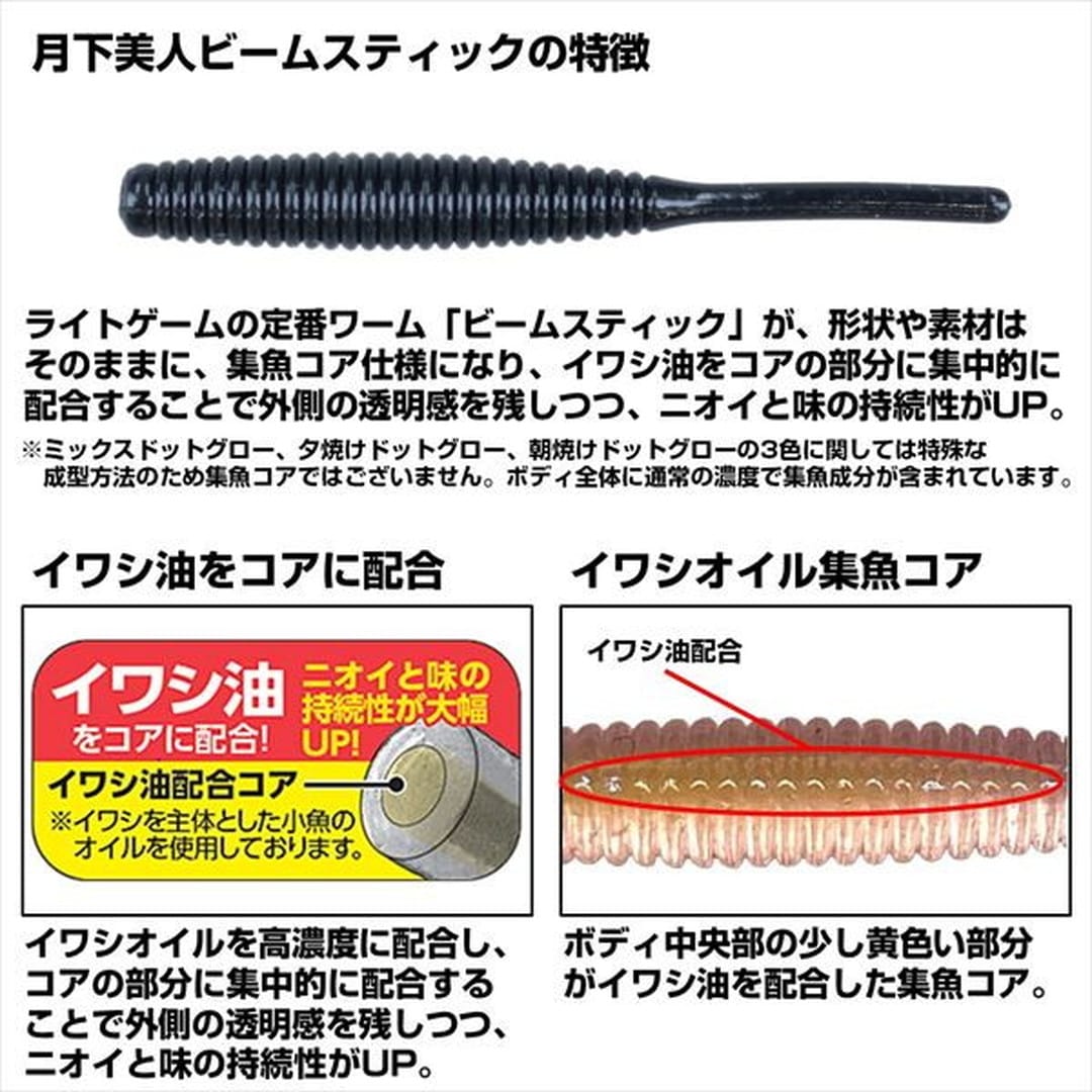 月下美人ビームスティックがコアにイワシ油を高濃度で配合し集魚力がパワーアップ!ライトゲームの定番ワーム「ビームスティック」が、形状や素材はそのままに、集魚コア仕様になってリニューアル。イワシ油をコアの部分に集中的に配合することで外側の透明感を残しつつ、ニオイと味の持続性がUP。