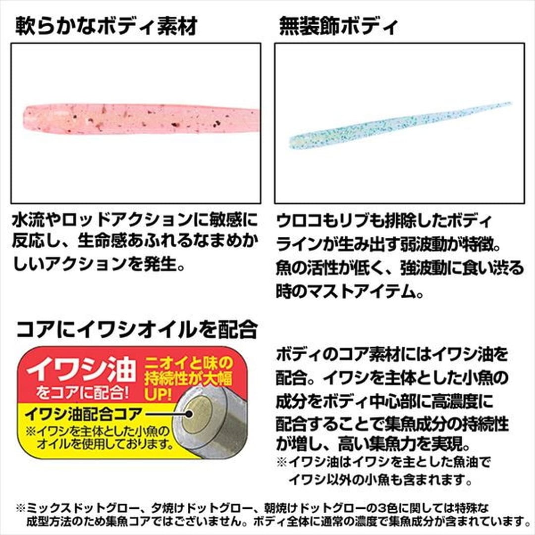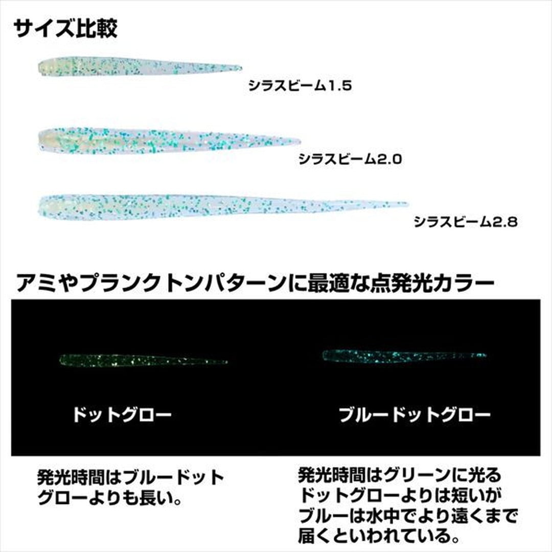 月下美人史上、最も柔らかい素材を採用。リアルなシラス形状と柔らかな波動がタフな状況で効果を発揮!水流やロッドアクションに敏感に反応し、生命感あふれるなまめかしいアクションを発生。極めて軟らかなボディ素材。■ウロコもリブも排除した無装飾ボディ。ほぼ無装飾ともいえるボディラインが生み出すナチュラルな弱波動が特徴。魚の活性が低く、強波動に食い渋る時のマストアイテム。■コアにイワシオイルを配合!ボディのコア素材には「イワシ油」を配合。イワシを主体とした小魚の成分をボディ中心部に高濃度に配合することで集魚成分の持続性が増し、高い集魚力を実現した。■シラスビーム2.0の太さはそのままに、長さをプラスすることで、過度なボリューム感は抑えつつ、しなやかさがアップ。アクションの変化が大きくなりアピール力が強くなった。また、表面積がアップしたことでフォールスピードが遅くなり、より浮遊感を演出しやすい。ボディ素材は2.0inch同様、極めて軟らかい素材を採用しているためロングボディにかかわらずアジの吸い込みは良好。