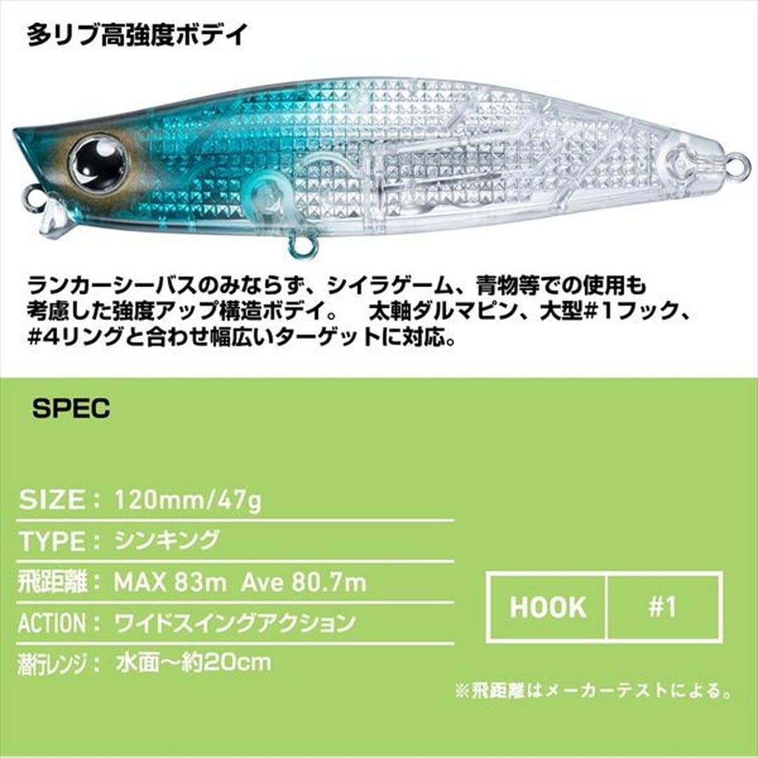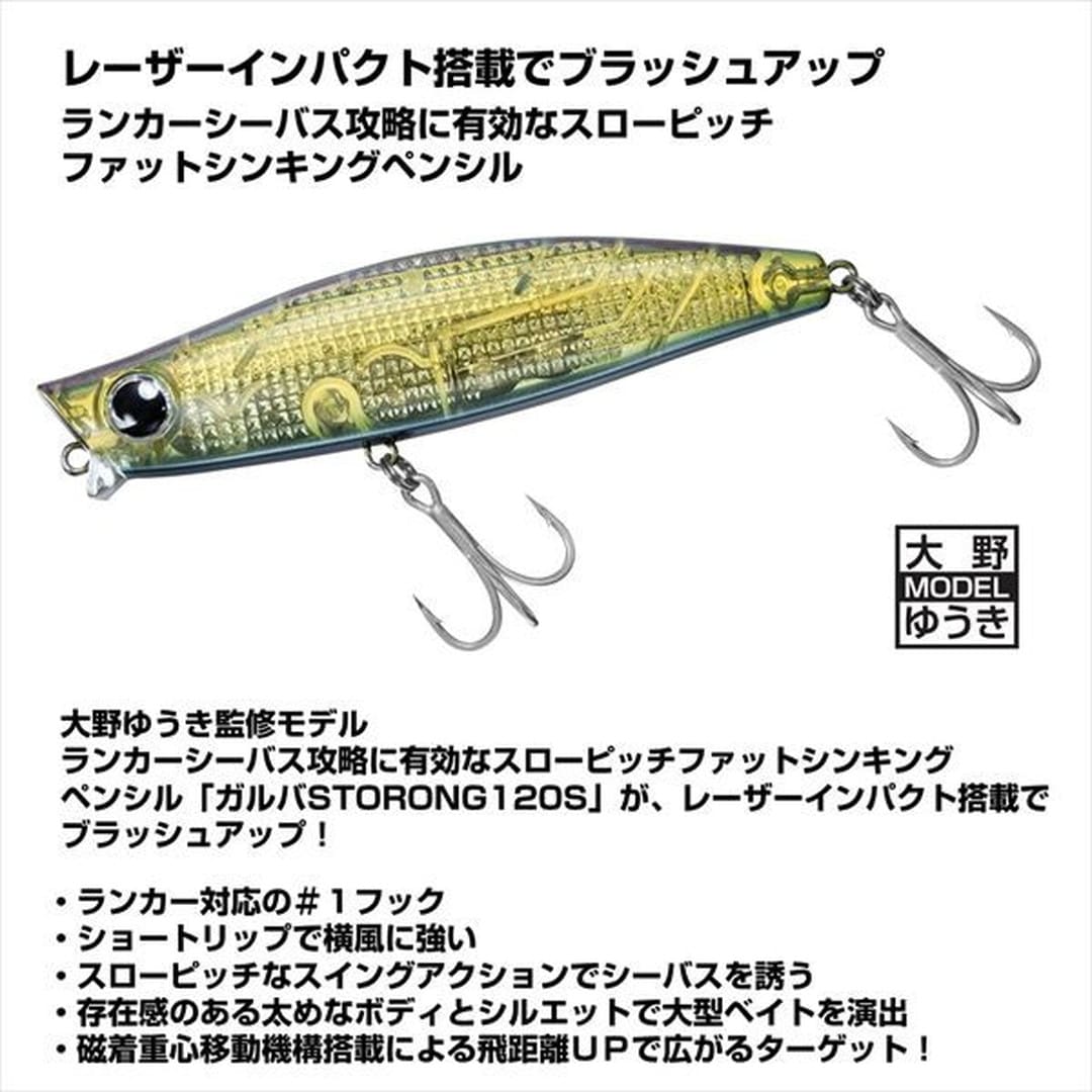 大野ゆうき監修 ランカーシーバス攻略に有効なスローピッチファットシンキングペンシル「ガルバストロング120S」が、レーザーインパクト搭載でブラッシュアップ!「この輝きには釣れる理論(ワケ)がある。」 レーザーインパクト(PAT.P)搭載。レーザーインパクトは、3Dマルチ反射構造により「イワシ」等と同様の高輝度反射光を多方向に放ち、「本物の誘いを遠くまで」を実現。更に、泳いでいる時の反射光の明滅まで再現。夜間や日陰のわずかな光でもベイトフィッシュと同様、昼夜・場所を問わず光でターゲットにアピール。
