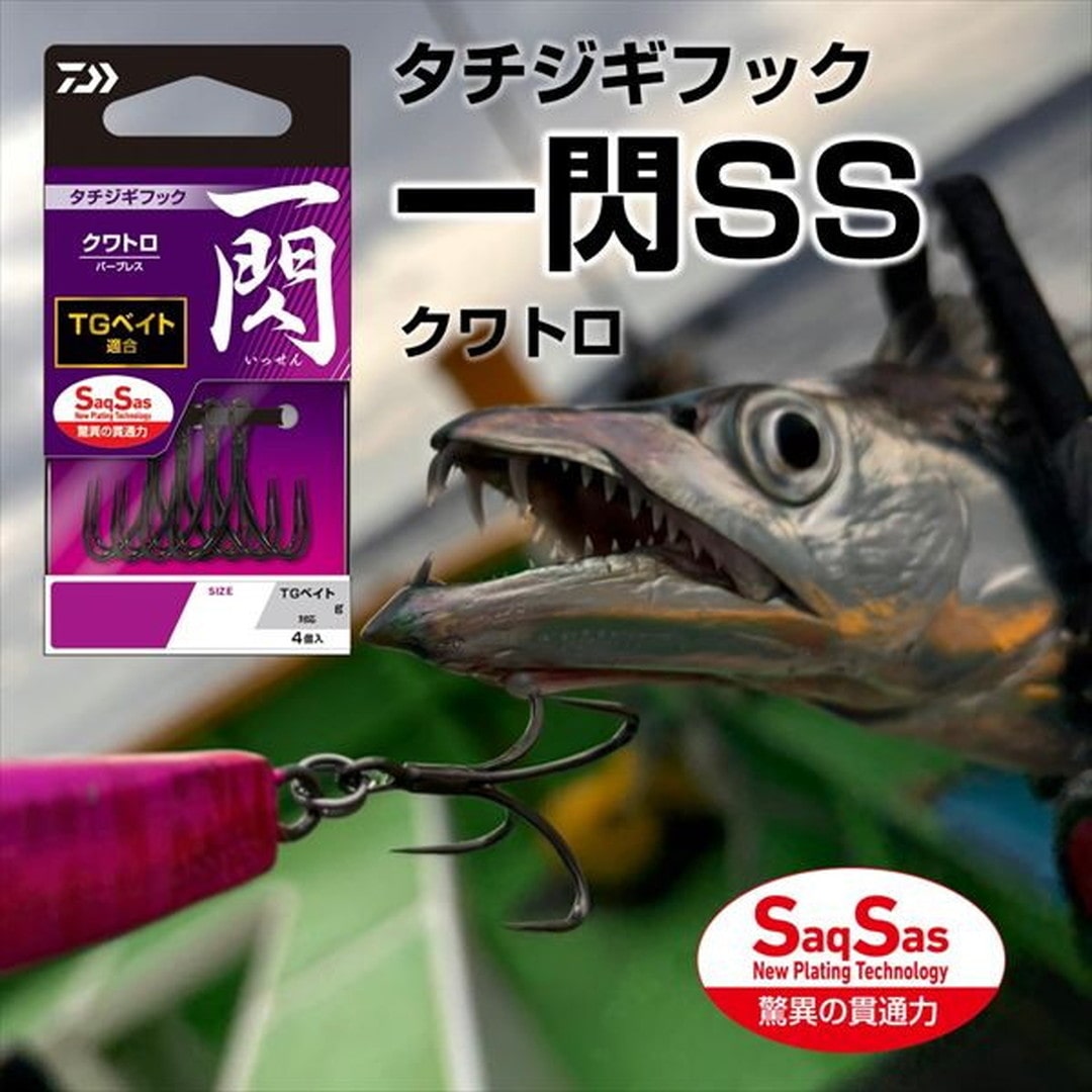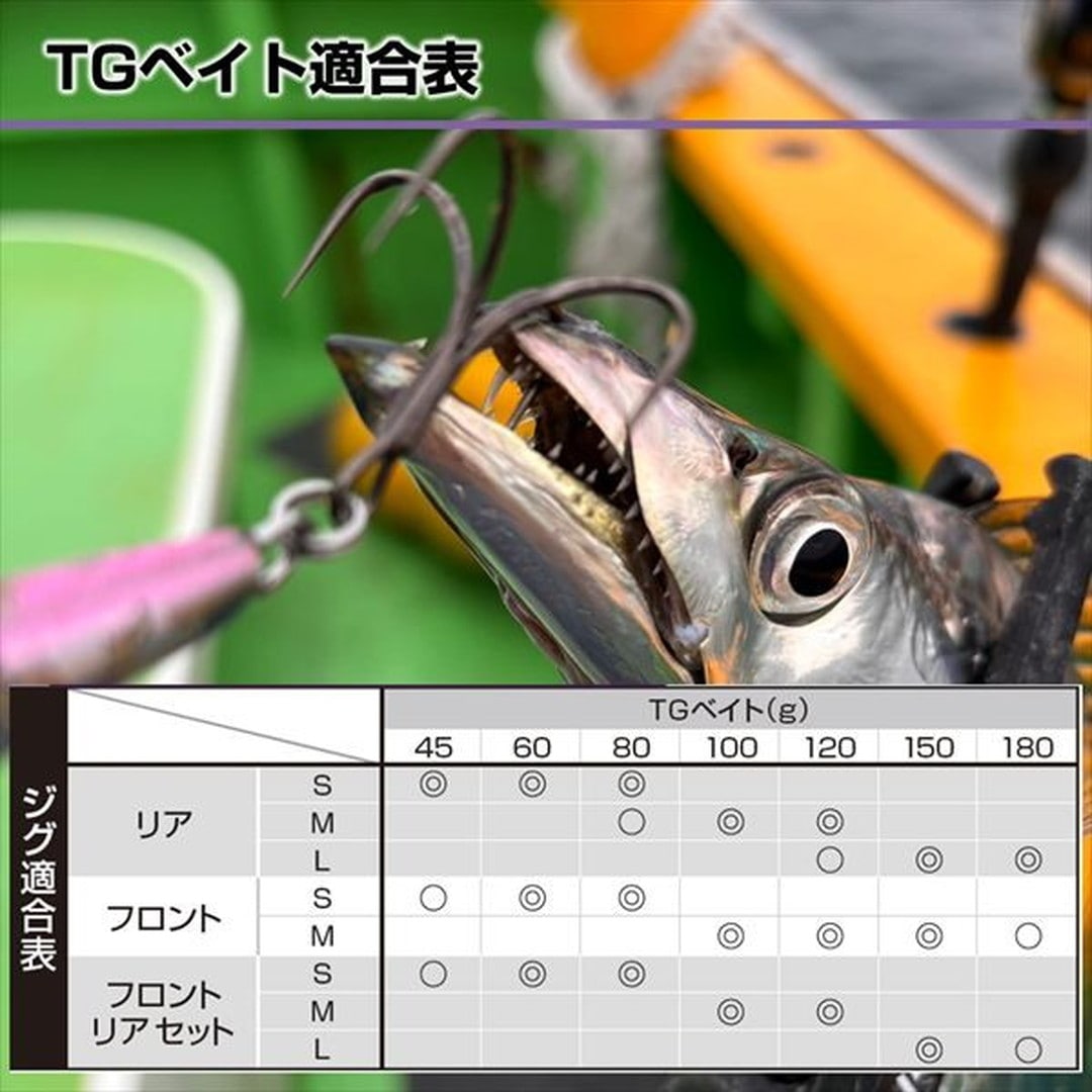 タチウオジギング用クワトロフック!TGベイトに完全適合!TGベイト(45~180g)に適合したタチウオジギング用クワトロフック。選べる3サイズ(S/M/L)をラインナップ。SaqSas加工を施したロングテーパーストレートポイントフックを採用し、高いフッキング性能と貫通力でターゲットのアゴを瞬時に貫く。平打ち加工により強度を高め、伸びにくく安心してファイトが可能。