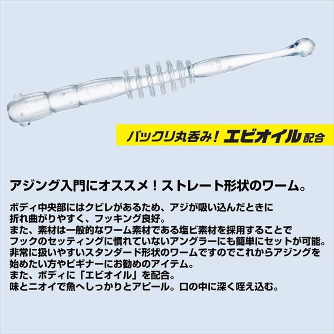 アジング入門におススメ!吸い込みの良いスリムボディで小魚をイミテート!アジング入門にオススメなストレート形状のワーム。アジがシラスのような小魚を食べている時に有効で、アジハンターワーム「リング」と使い分け、その日にあった形状の選択がお勧め。ボディ中央部にはクビレがあるため、アジが吸い込んだときに折れ曲がりやすくフッキング良好。また、素材は一般的なワーム素材である塩ビ素材を採用することでフックのセッティングに慣れていないアングラーにも簡単にセットが可能。非常に扱いやすいスタンダード形状のワームなので、これからアジングを始めたい方や初心者の方にお勧めのアイテム。また、ボディに「エビオイル」を配合。味とニオイで魚へしっかりとアピール。口の中に深く咥え込む。
