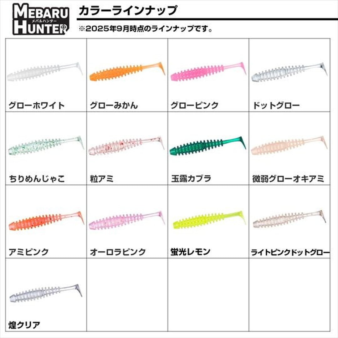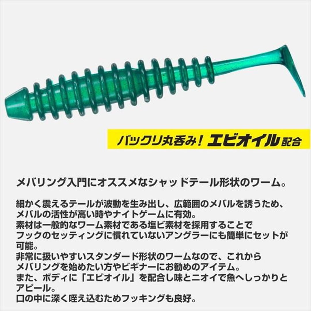 メバリング入門におススメ!細かくふるえる尻尾で広範囲のメバルを寄せる微波動アクション!メバリング入門にオススメなシャッドテール形状のワーム。細かく震えるテールが波動を生み出し、広範囲のメバルを誘うため、メバルの活性が高い時やナイトゲームに有効。ナチュラルで軟らかいアクションを生み出すメバルハンターワーム「リーチ」と使い分け、その日にあった形状の選択がお勧め。また、素材は一般的なワーム素材である塩ビ素材を採用することでフックのセッティングに慣れていないアングラーにも簡単にセットが可能。非常に扱いやすいスタンダード形状のワームですので、これからメバリングを始めたい方や初心者の方にお勧めのアイテム。また、ボディに「エビオイル」を配合し味とニオイで魚へしっかりとアピール。口の中に深く咥え込むためフッキングも良好。