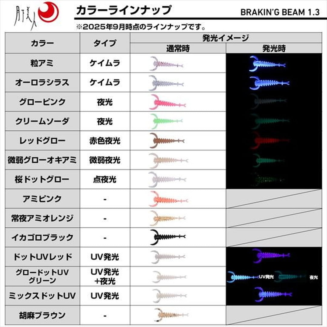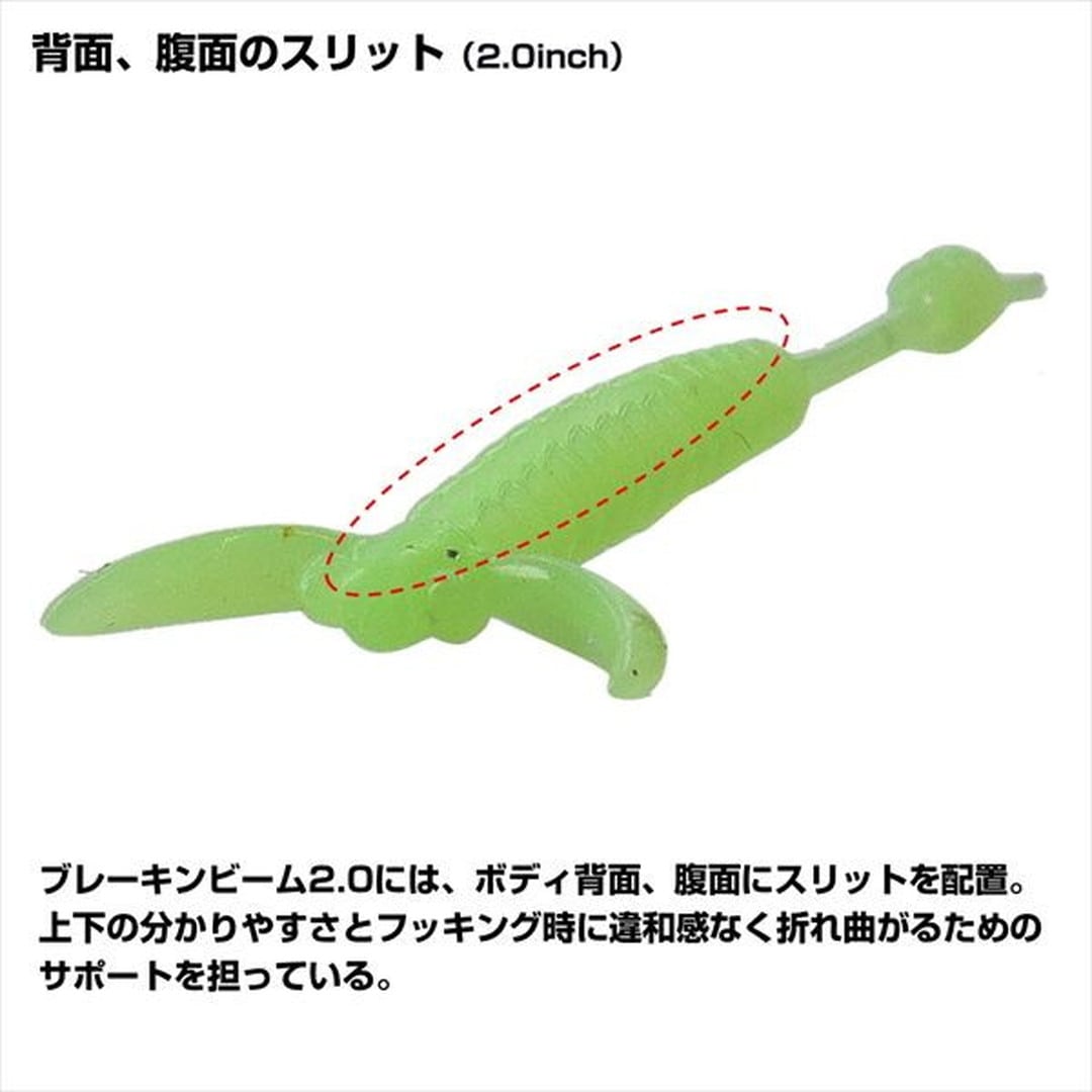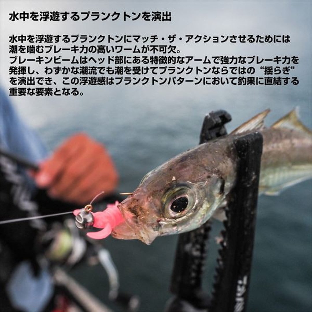 渡邉長士テスター監修。水中を浮遊するプランクトンを演出!水中を浮遊するプランクトンにマッチ・ザ・アクションさせるためには潮を噛むブレーキ力の高いワームが不可欠。ブレーキンビームはヘッド部にある特徴的なアームで強力なブレーキ力を発揮し、わずかな潮流でも潮を受けてプランクトンならではの“揺らぎ”を演出でき、この浮遊感はプランクトンパターンにおいて釣果に直結する重要な要素となる。浮遊感を出すためにはジグヘッドを軽くすることが必須だったが、ブレーキ力が強いため重めのジグヘッドを選択できるようになり、飛距離アップをしつつスローな攻めが可能になった。