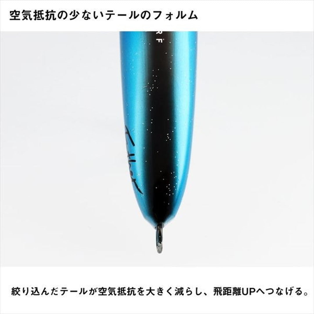 魅惑サウンド×超バブル。湧き上がる熱狂を。ソルティガフロッサーはきめ細やかな泡を纏い、魅惑のポップサウンドを奏でながら水中の魚を魅了するポッパーである。カップ上部は泡を噛みやすい様、深めに設定し、下部は浅くし、泡をたてられるような形状とした。それにより、リトリーブ時に深く潜りすぎず、水面直下を細かな泡と共に泳ぐ。また、ポッパーは高浮力タイプが多く、浮力を保つために沢山のウエイトを積めないが、ソルティガフロッサーはギリギリまでウエイトを積み、また、横風を受けた時にバランスを崩しにくいフォルムで飛行姿勢を安定させ、飛距離のアドバンテージを確保した。水中での浮き姿勢は垂直浮きで、一回目のジャークで潜りすぎず、レスポンスもよくなる。直線的でレスポンスの良いポッパーなので、リズミカルにテンポよく、まるでダイビングペンシルを扱えるポッパーである。