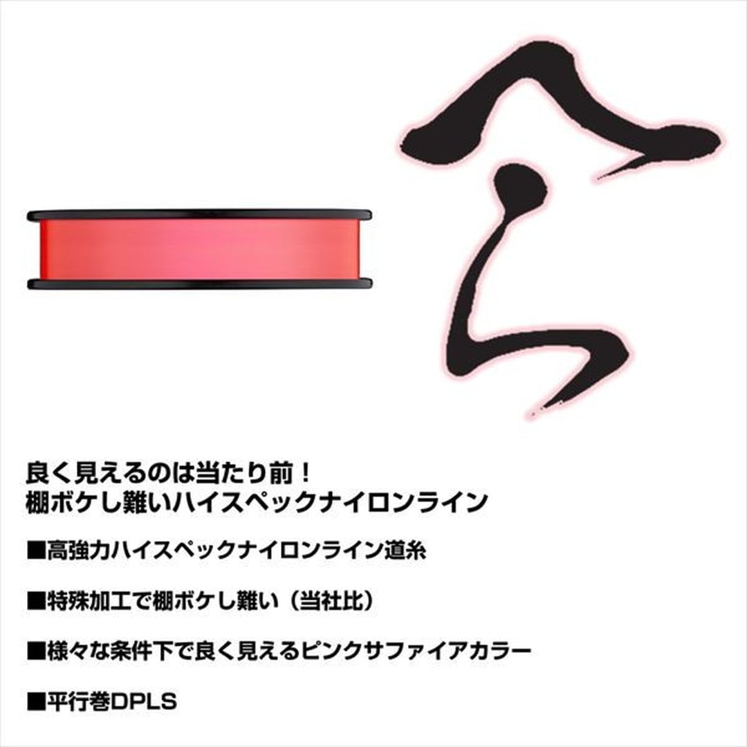 く見えるのは当たり前!棚ボケし難いハイスペックナイロンライン!高い強度を兼ね備えた、ハイスペックなナイロンラインの道糸。特殊加工により棚ボケし難い仕様。さらに、様々な条件下でも視認性の高いピンクサファイアカラーを採用しているため見えやすい。