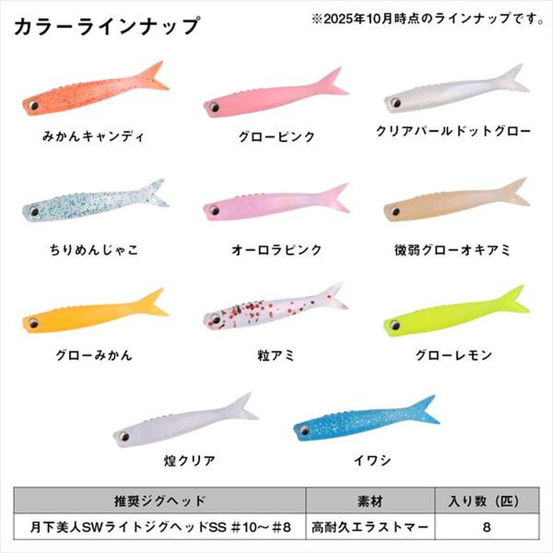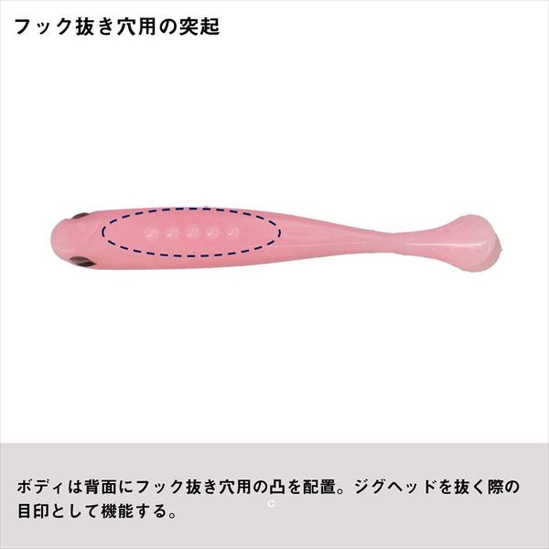 ミドストができる!ロールアクションで誘える小魚ワーム。リアルな尾びれを搭載した小魚シェイプのワーム。ボディをロールさせながら広範囲のメバルにアピールすることができるミドストアクション対応。低活性時にはただ巻きでもピリピリとアクションするテールで魅了する。エビオイルを配合。味とニオイでヒットチャンスを更に広げる。