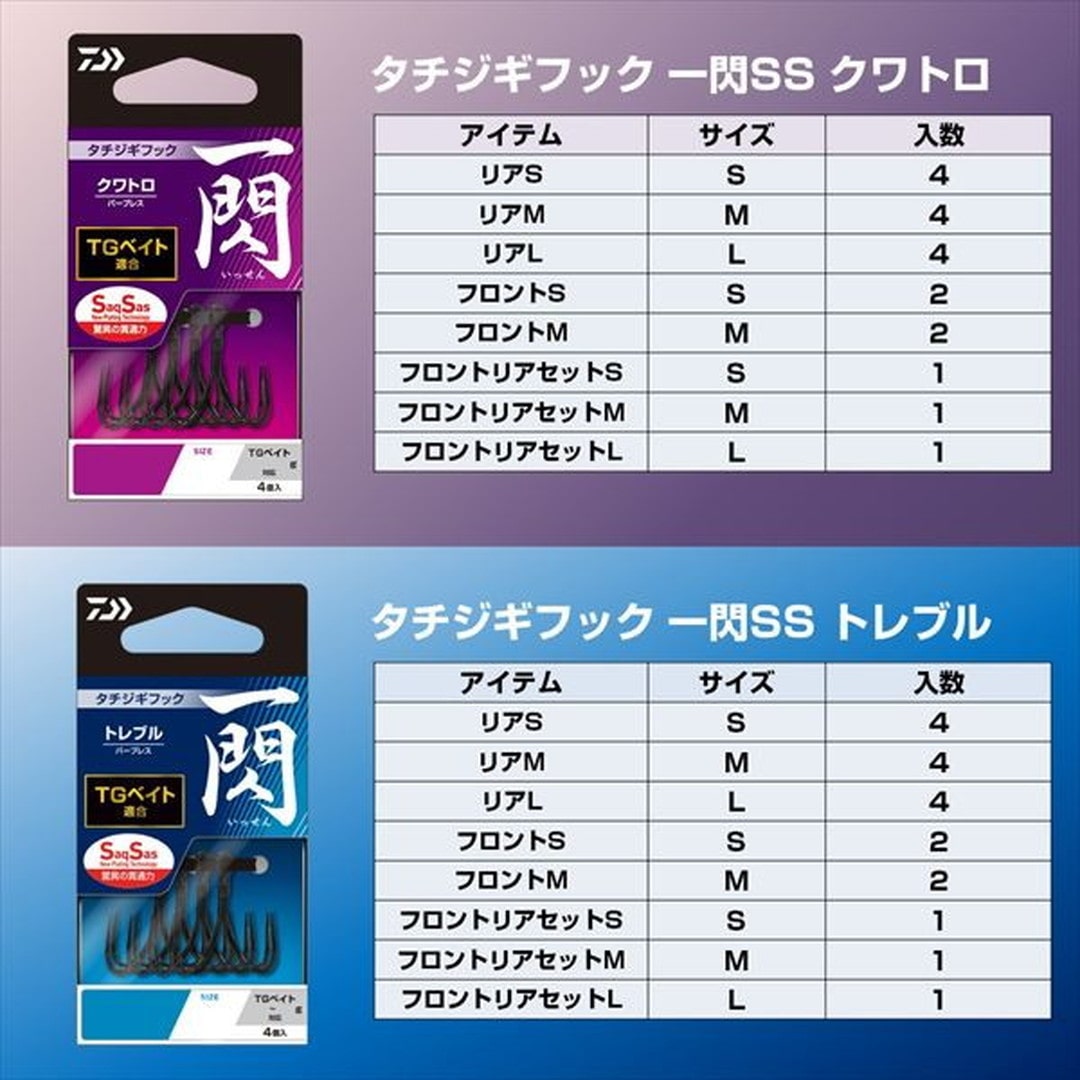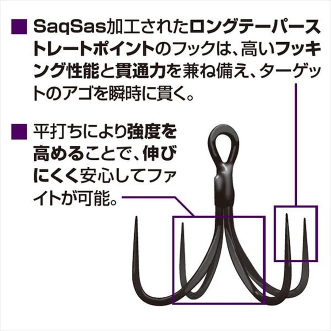 タチウオジギング用クワトロ・トレブルフック!TGベイトに完全適合!TGベイト(45~180g)に適合したタチウオジギング用クワトロ・トレブルフック。選べる3サイズ(S/M/L)をラインナップ。SaqSas加工を施したロングテーパーストレートポイントフックを採用し、高いフッキング性能と貫通力でターゲットのアゴを瞬時に貫く。平打ち加工により強度を高め、伸びにくく安心してファイトが可能