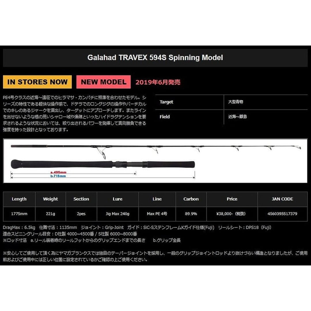 『ギャラハドトラベックス 594S-パワーと軽快さを両立させ、2ピース構造の利点を最大限発揮した強靭なバットパワーが魅力』PE4号クラスの近海~遠征でのヒラマサ・カンパチに照準を合わせたモデル。シリーズの特性である軽快な操作感で、ドテラでのロングジグの操作やバーチカルでのキレのあるジャークを演出し、ターゲットにアプローチします。またラインを出せないような根の荒いシャロー域や漁礁といったハイドラグテンションを要求されるような状況においては、絞り出されるパワーを発揮して真向勝負できる強度を持った設計となっております。