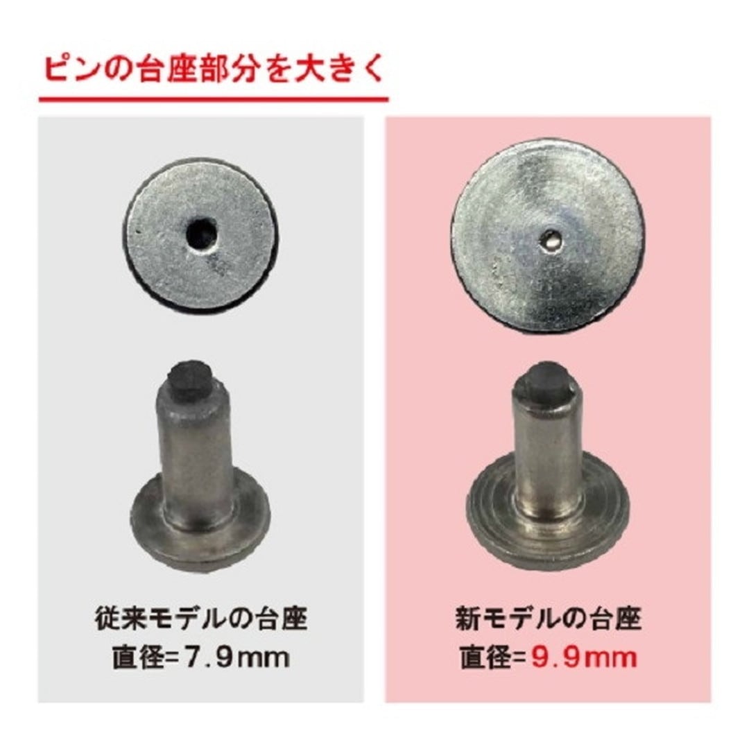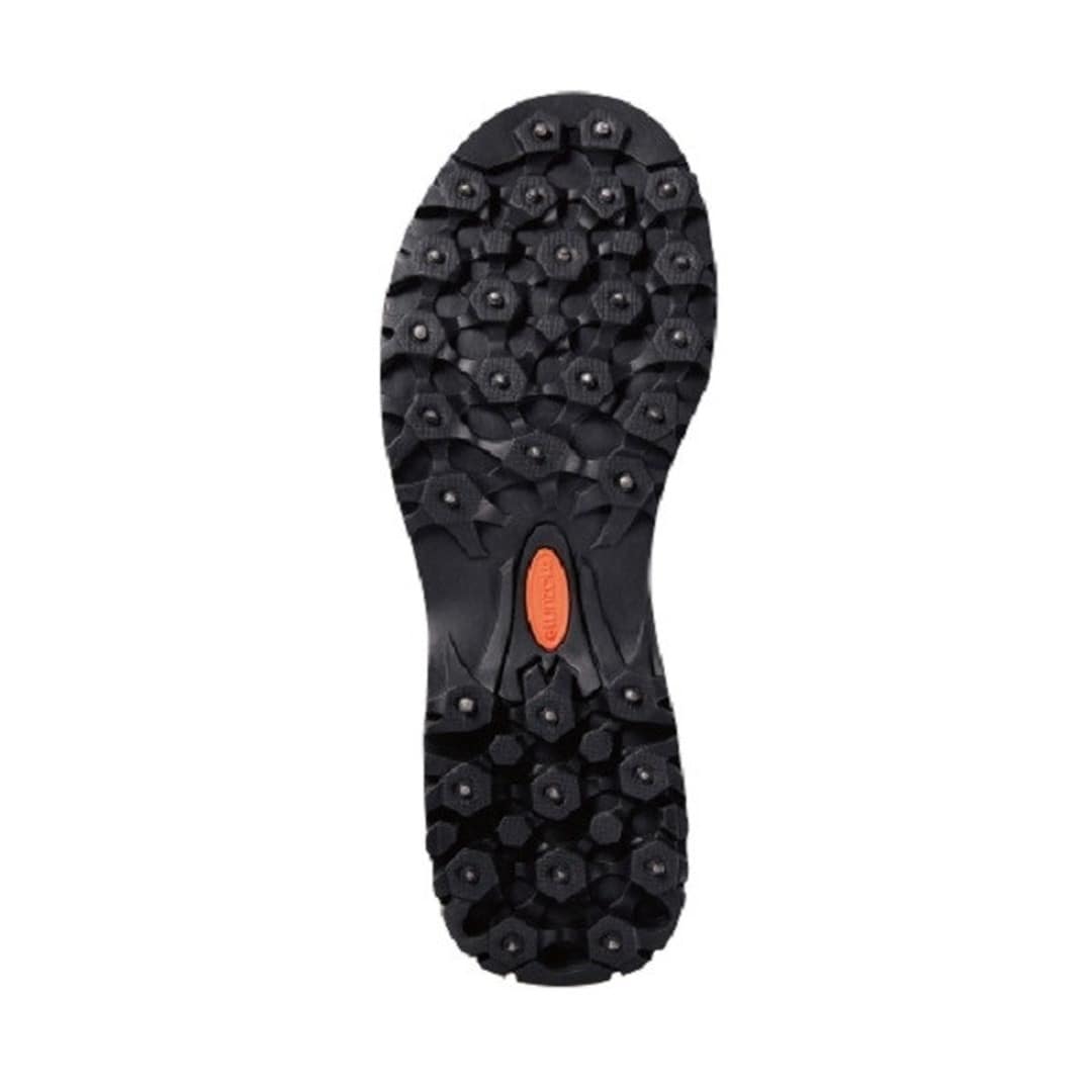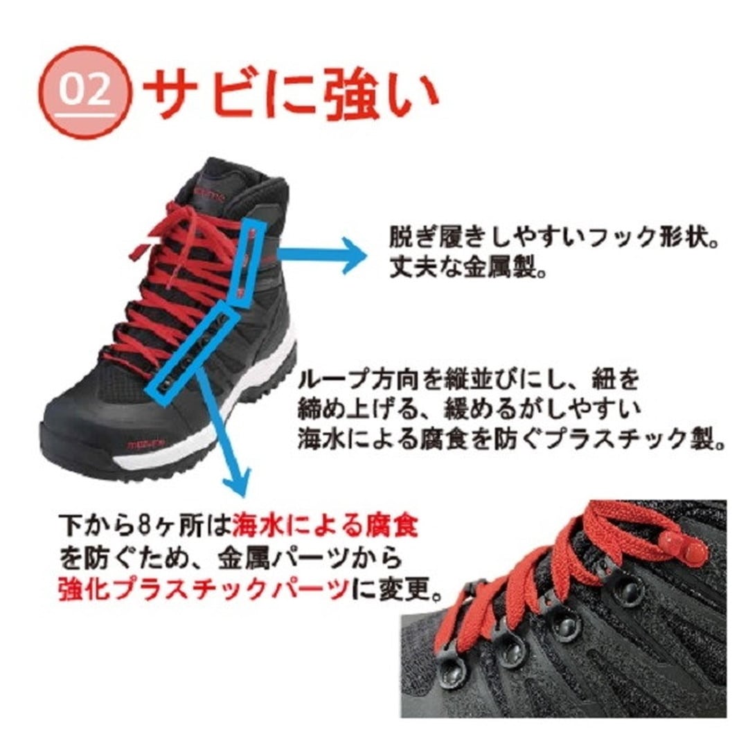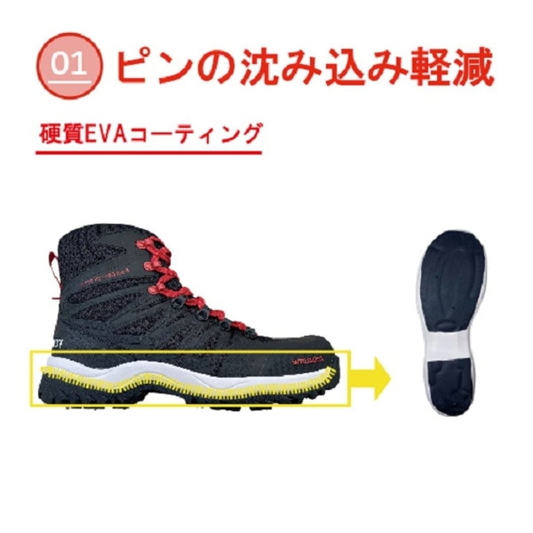 タングステンピンの沈みこみを防ぐために、ピンの土台部分の大きさを足つきに影響が出ない程度に大きくしました。また、ミッドソールのピンの土台部分が設置する面にコーティングを施しピンが沈みこみにくくなりました。全14か所あるシューレースホール。その中の、下から4段目までの8個を金属パーツからプラパーツに変更。錆びでシューレースが切れることを軽減。上3段の6個はこれまで通り強度を重要視した金属パーツを採用。これまではプラパーツに強度の面で不安があり、採用していませんでした。技術の進化が、強度が高いプラパーツの使用を可能にしました。