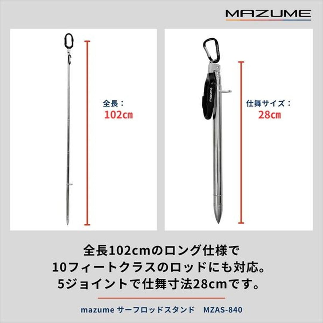 強風に煽られてもロッドが倒れない!専用設計ストッパー付き。コンパクト設計:仕舞サイズ28cm、ロング仕様:全長102cm!mazumeロゴ入りキャップ付き。リールに砂をつけたくないサーフアングラーとって、サーフロッドスタンドはもはや必須のアイテムです。それをmazumeがより使いやすくしました。新機能!本体を地面に刺しやすいフットパーツを搭載!新たに追加されたフットパーツにより、かがむことなく足で踏んで本体を地面に刺すことが可能になりました。収納の邪魔にもならず、ウェーダーでも踏める絶妙な大きさに設定しました。