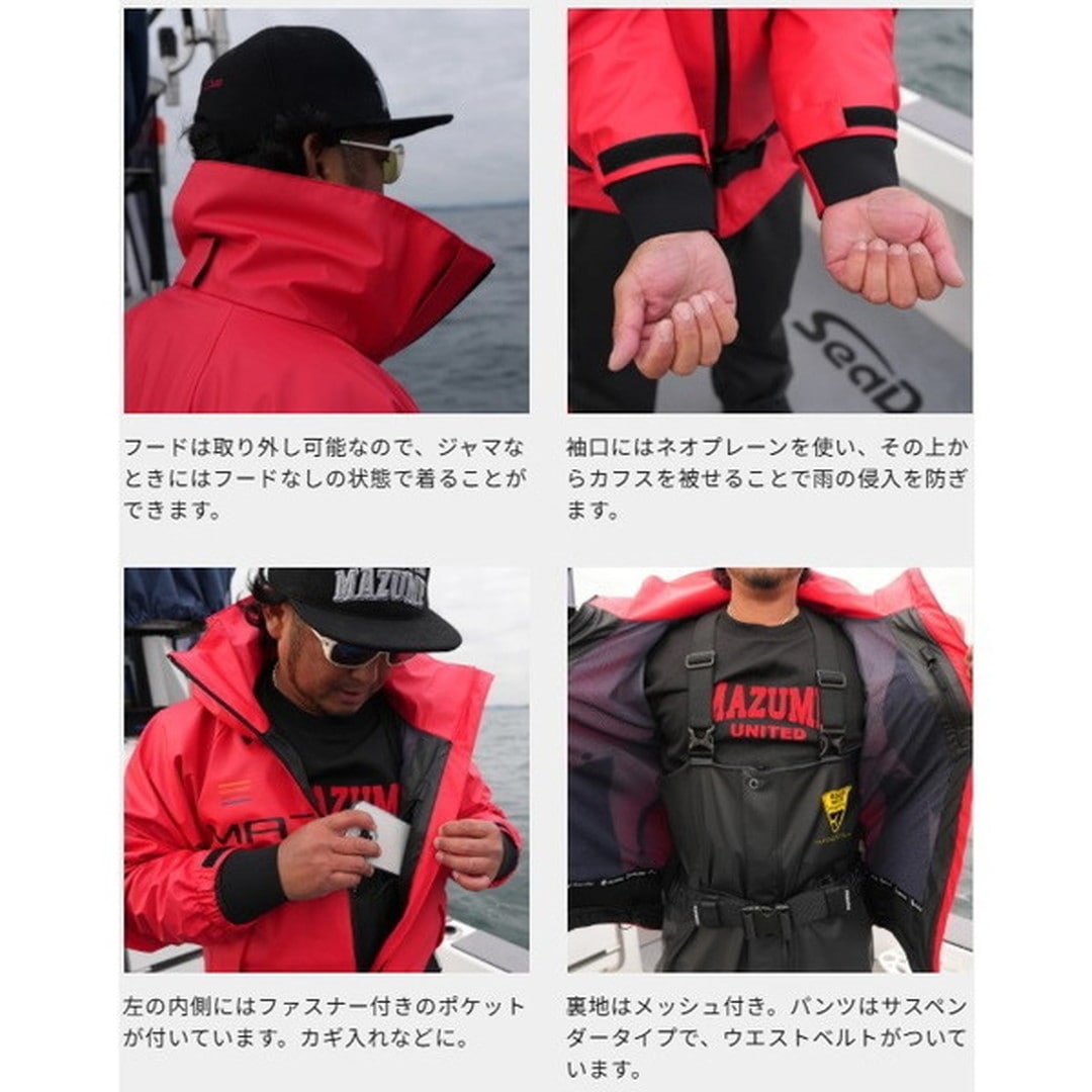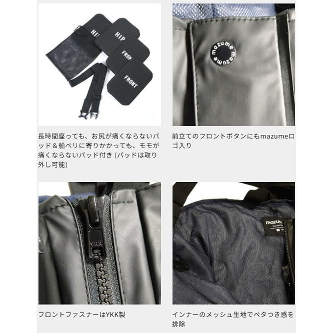 mazume ROUGH WATERレインスーツは、オフショアで信頼される機能性を、釣り人のためのディテールで仕上げた一着です。【PU(ポリウレタン)素材の魅力】・優れた防風・防水性能に加え、血や魚のヌメリもサッと落とせるメンテナンス性・軽く、しなやかで、キャストやシャクリなどの反復動作にもストレスなく追従・汚れたままでも、釣行後にホースで水をかけるだけでOKという手軽さ。釣りに特化して設計されたPU素材のレインスーツは、重たい塩ビ素材と比べて圧倒的に軽く、動きやすさが段違いです。【細身&スタイリッシュなシルエット】一般的な業務用レインウェアにありがちな野暮ったさはなく、インナーの着用を想定した細身の設計。さらに、裏地にメッシュを採用しているため、汗や湿気によるベタつきも軽減されます。mazumeの定番コンセプト『フィッシングフィット』を継承し、海上でのハードな動作にも対応。見た目、機能、手入れのしやすさ。全てを妥協せずに仕上げた、本気のPUレインスーツです。