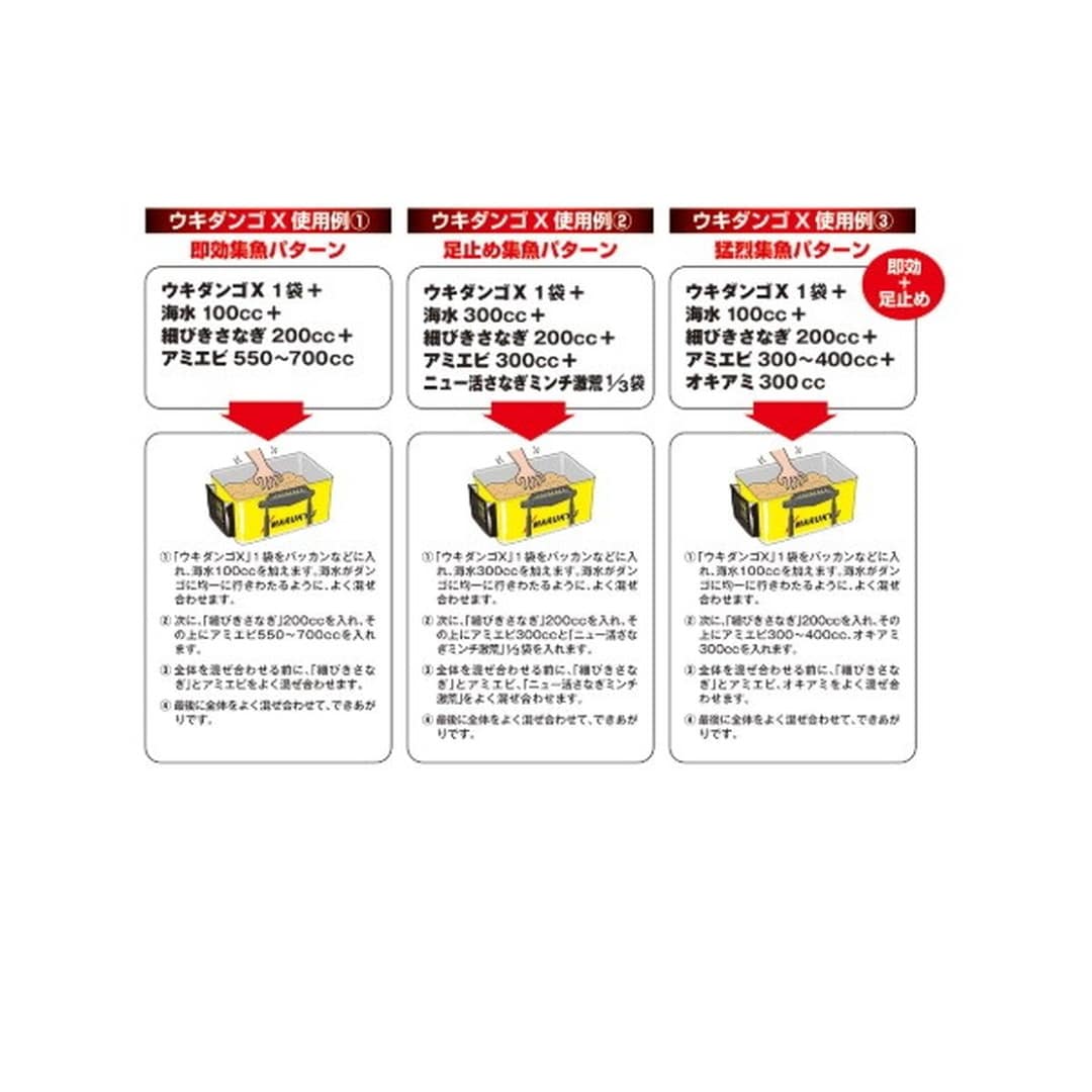 握りやすく、すばやく寄せる。握りやすいウキダンゴ釣り用配合エサ。ダンゴが着底後、芯残りせずスムーズに崩れます。握り加減によって崩れ具合をコントロール可能。チヌが好む、さなぎ、ムギ、コーン、スパイスを配合しているため、すばやく寄せられます。水分が多いオキアミやアミエビとも相性が良好。