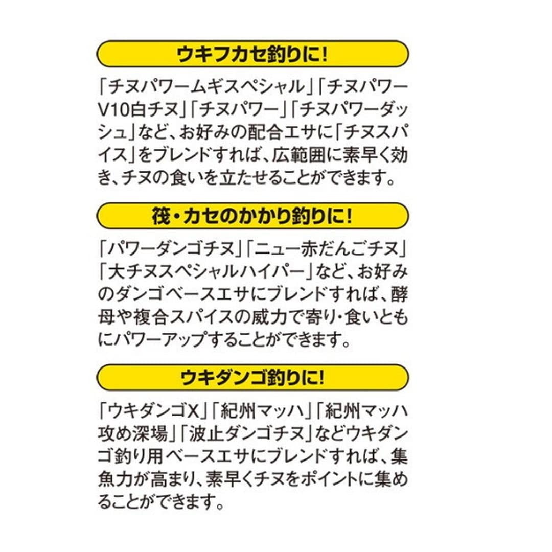 「複合スパイス&酵母」で強力集魚。ニンニクをはじめとして酵母、センキュウ、さなぎなどの複合スパイスを配合した強力集魚タイプ!釣り場の釣況に合わせてブレンドすれば、チヌを刺激し活性を高めます。