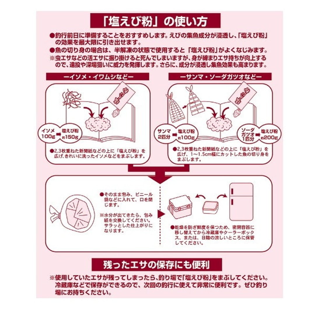 エサ持ちを高め、エビ効果をプラス。魚の切り身、イカタン、虫エサにまぶすと、身が締まってエサ持ちと手返しがアップ。同時に、配合したエビの成分が集魚・摂餌力も高めます。● 投げ釣りエサ用まぶし粉● 注意:虫エサなどの活きエサに振りかけると死んでしまいますが、身が締まりエサ持ちが向上するので、遠投や深場狙いに威力を発揮します。 さらに成分が浸透し集魚効果も高まります。