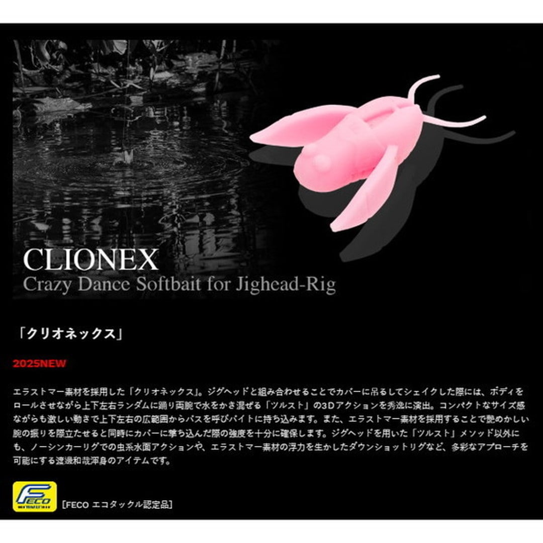 エラストマー素材を採用した「クリオネックス」。ジグヘッドと組み合わせることでカバーに吊るしてシェイクした際には、ボディをロールさせながら上下左右ランダムに踊り両腕で水をかき混ぜる「ツルスト」の3Dアクションを秀逸に演出。コンパクトなサイズ感ながらも激しい動きで上下左右の広範囲からバスを呼びバイトに持ち込みます。また、エラストマー素材を採用することで艶めかしい腕の振りを際立たせると同時にカバーに撃ち込んだ際の強度を十分に確保します。ジグヘッドを用いた「ツルスト」メソッド以外にも、ノーシンカーリグでの虫系水面アクションや、エラストマー素材の浮力を生かしたダウンショットリグなど、多彩なアプローチを可能にする渡邊和哉渾身のアイテムです。