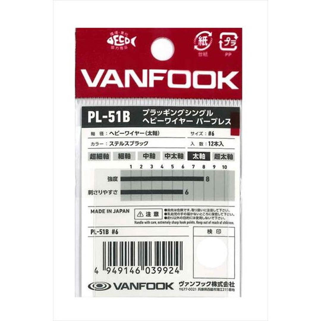 「PL-51B」はトレブルフックとの重量バランスの互換性を追求。シングルフックながら高ウェイトで、トレブルフックがついているネイティブ用ミノーからの交換でもアクションのバランスを崩すことがありません。また、太軸ながら鋭敏な針先を持ち、大型トラウトの固い口周りにもしっかりとフッキングすることができます。