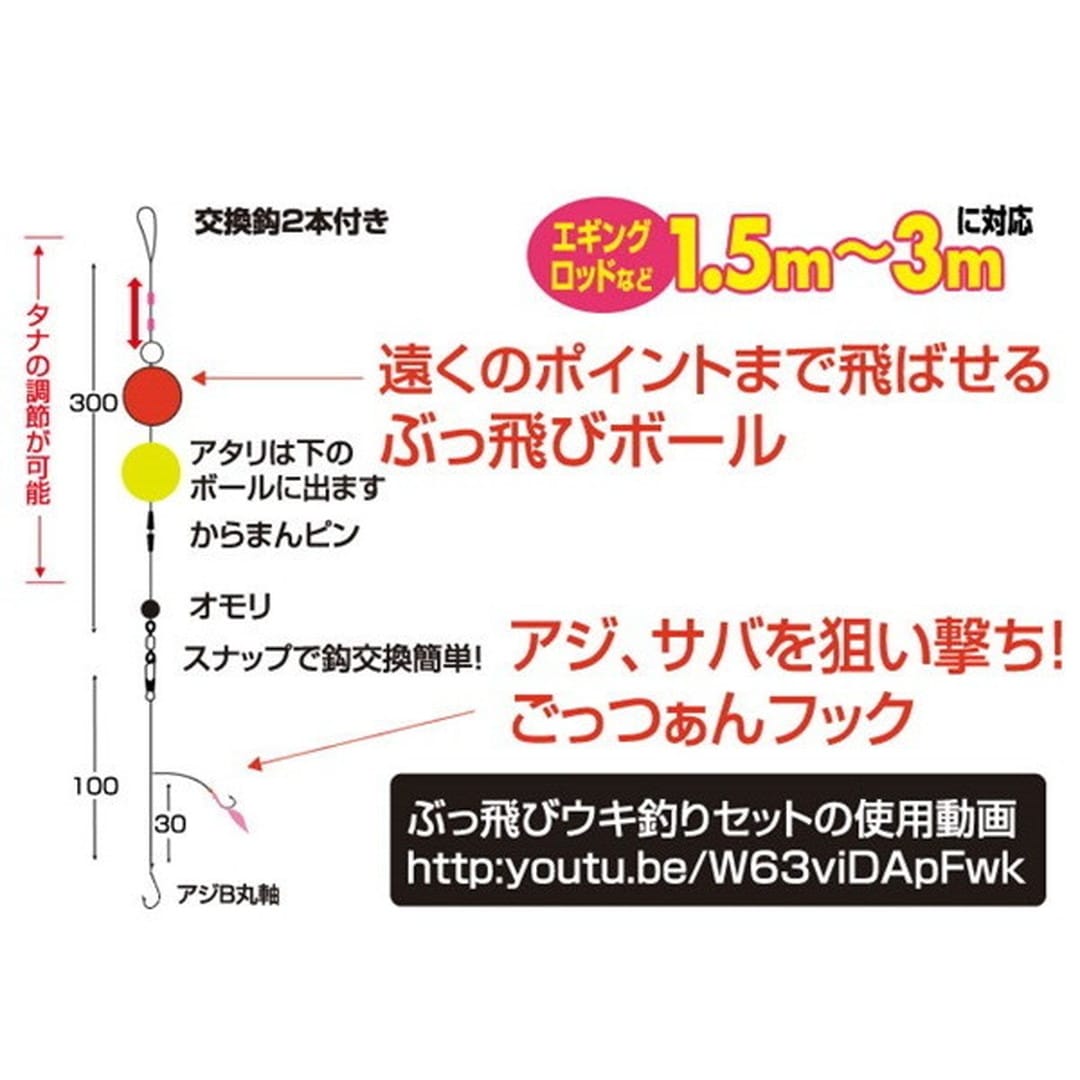 ●手軽に遠投!遠くのポイントを狙い打ち●ビギナーでもぶっ飛びボールで楽々遠投可能。・セットはチチワを結ぶだけ。・ごっつぁんフックでアジ、サバ、イワシを狙い撃ち。●エギングロッドなど1.5m~3mに対応