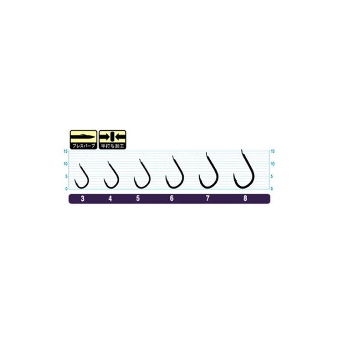 カエシを半分ツブした様な形に成形するプレスバーブ採用により、スレ鈎に匹敵する刺さりとエサ止め効果を両立。素材が柔軟な焼入れ前にプレスを行うので、鈎先に損傷は無く、パーフェクトな強度と靭性を誇ります。