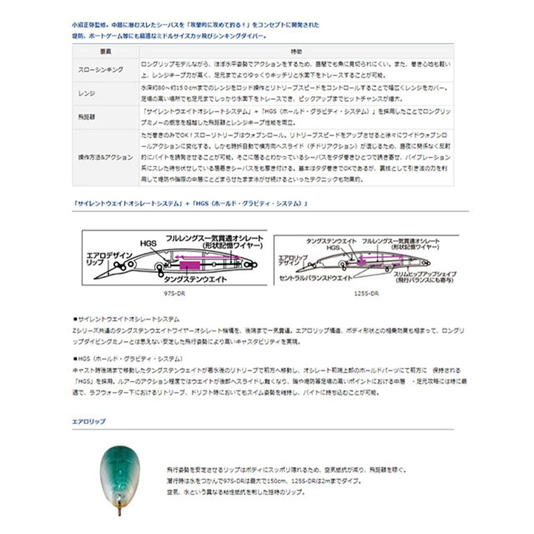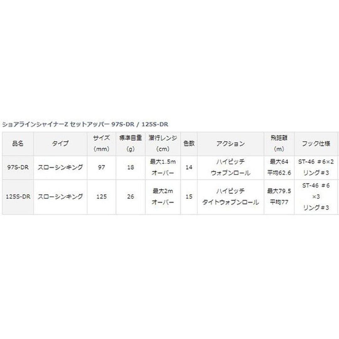 [SHORELINE SHINER Z SETUPPER 125S-DR]小沼正弥完全監修。テッパンだけでは芸が無い、誰もが苦手にしている堤防、磯等における中層と足元を攻められるぶっ飛びサーチシンキングダイバー 「僕が知ってるミノーのなかで一番飛ぶ」と小沼正弥に言わしめた「ショアラインシャイナーZ 125SDR」が新生。キャスタビリティ・レンジキープ性能を追求したスローシンキング設定ながら、多用するスロー~ミディアムでのレスポンスを徹底追求。小沼の卓越した経験とフィールドテストを繰り返した末にたどり着いた、こだわりの「釣れるハイピッチタイトウォブンロールアクション」が持ち味。「タダ巻きのスローリトリーブ」でもしっかりした引き心地と強烈なフラッシング&波動を発生。また、流れの変化で自動的に生まれるイレギュラースライドアクションが食わせの間を与え、特別なロッドアクションの入力は不要。低活性でシビアなシーバスのキスバイト(口先でつつくようなバイト)にも対応するこだわりの#6サイズ×3本フックシステム採用。