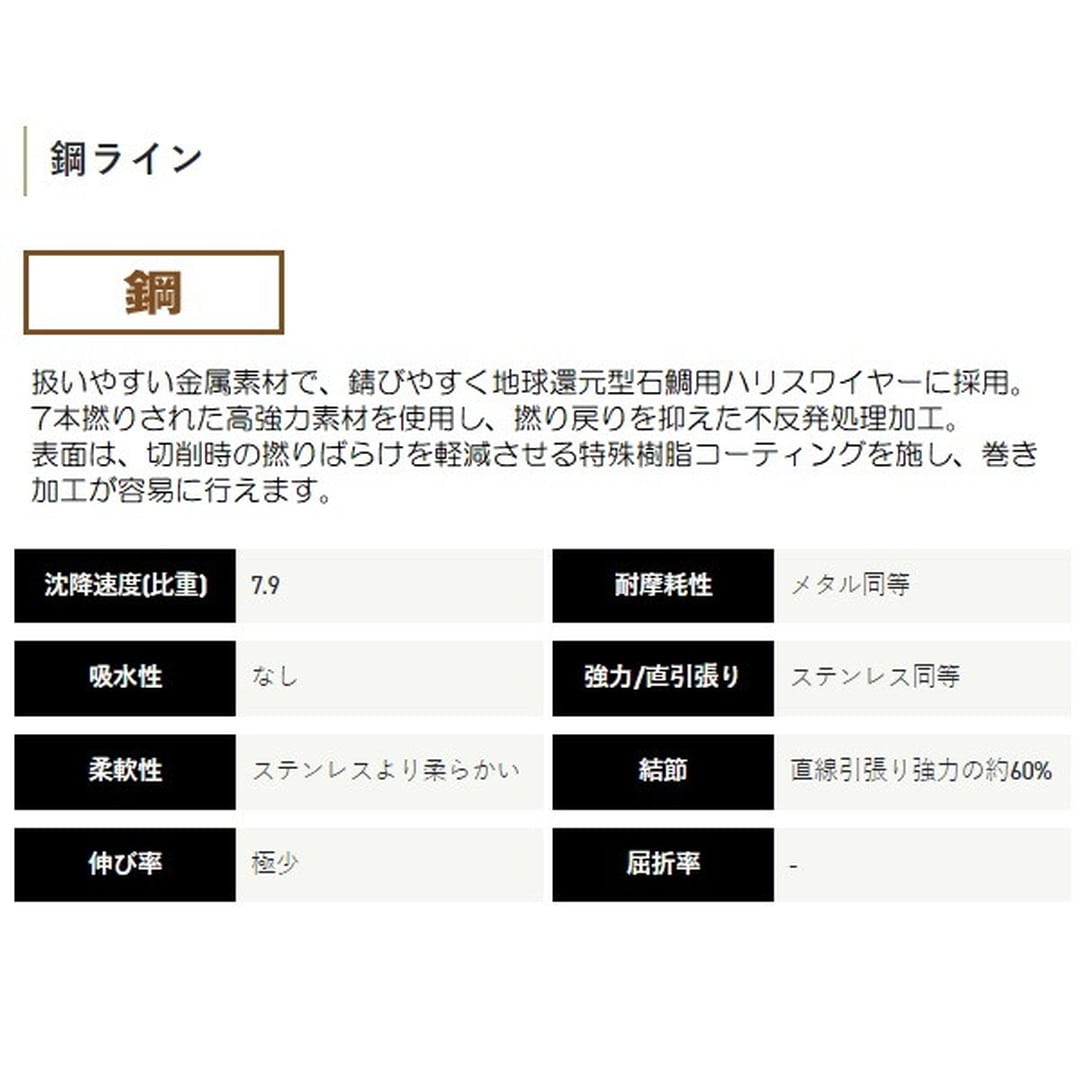 歴史に残る鋼ワイヤー。●オリジナルディッピング加工による表面がなめらかな糸質により、スレた怪物の喰いを誘発します。●耐キンク性に優れ、撚りバラケを抑えた「特殊焼入れ加工」により耐久性がさらにアップしました。●自然環境に優しい鋼100%のハリスワイヤーを採用しました。●張りのある7本撚りとしなやかな19本撚りをラインナップ。●カラーは反射・ギラツキを抑えた「ガンブラカラー(ガンメタブラック)」を採用。