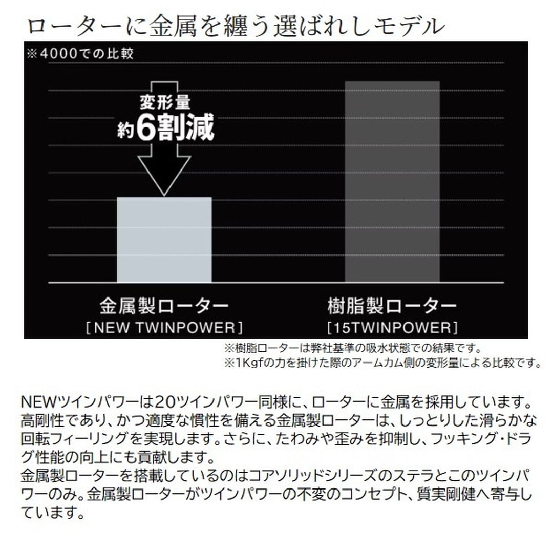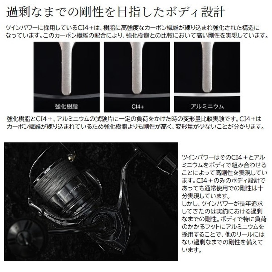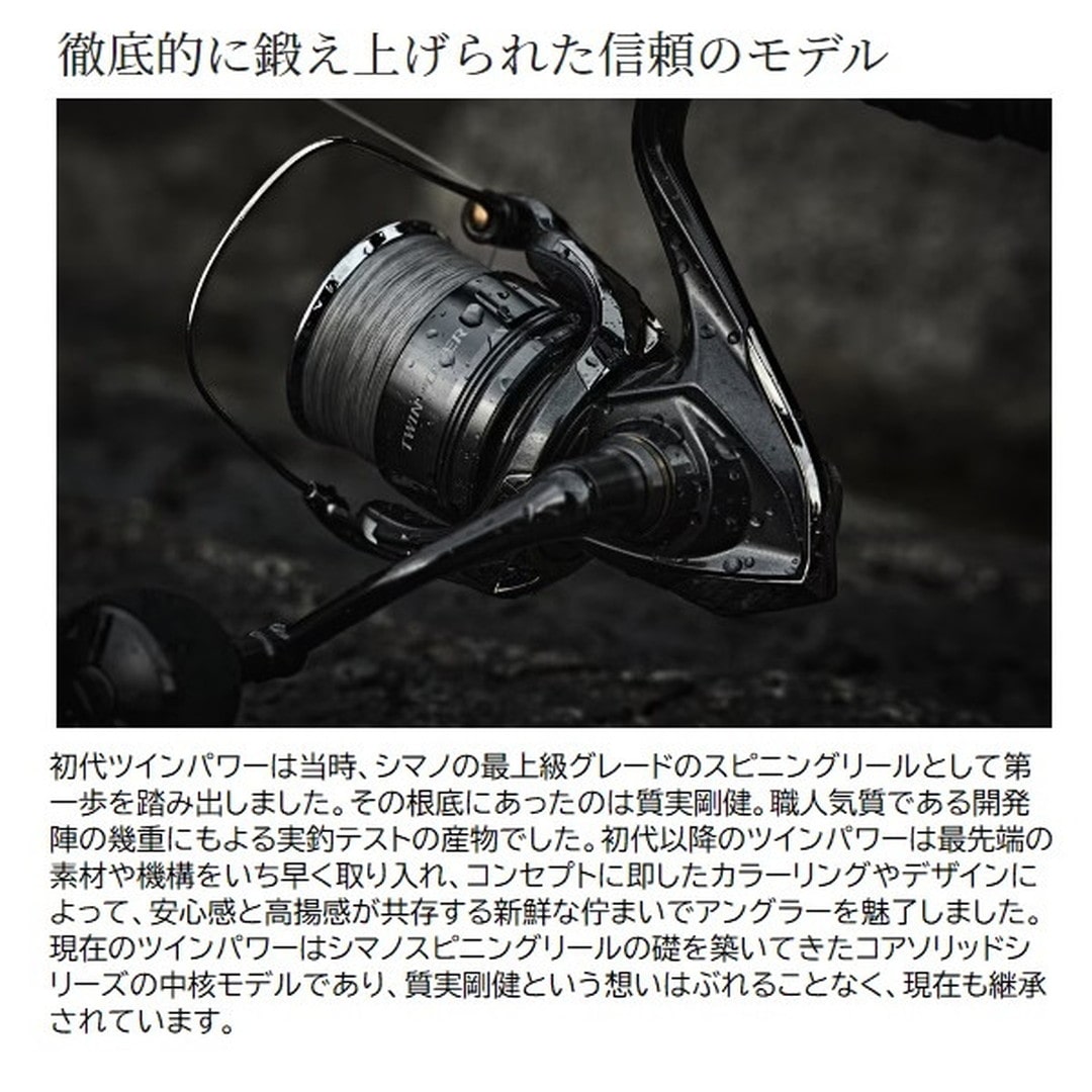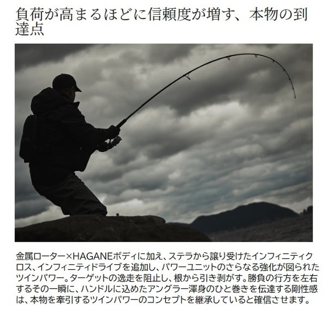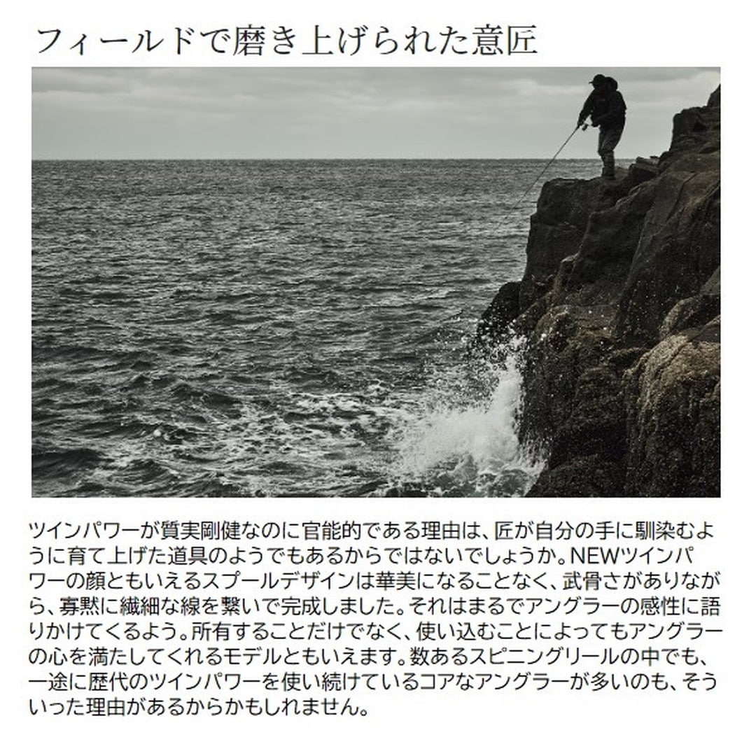 質実剛健。スピニングリールの可能性を広げ続け、盤石の進化を遂げたツインパワー。現モデルまで一貫して過飾をせず、実釣における耐久性、機能的であることを追い求めてきました。■3000MHG・・・パワーと繊細さを兼ね揃えたモデル。4000番サイズ系ボディに2500番サイズ系のコンパクトなスプール&ローターを搭載した3000モデル。4000番サイズのパワフルな巻き上げと、コンパクトなローターで、繊細な巻きとパワーを両立したモデル。スプールは2500、C3000と互換性があるため汎用性も高くなっています。