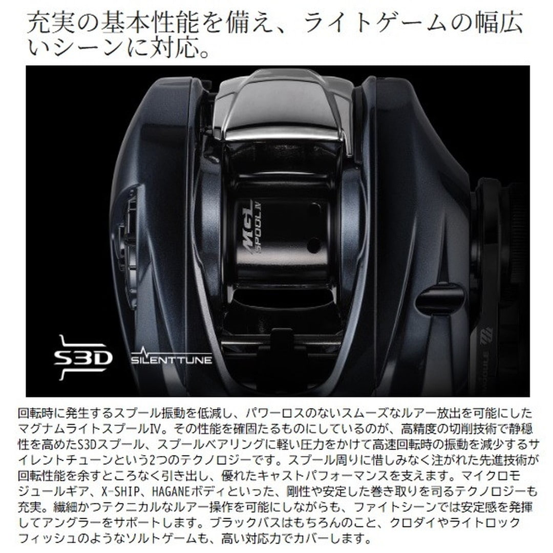 マグナムライトスプール4×I-DC5搭載でテクニカルゲームを切り拓く。DCユニットの小型化により小径スプールへのDCブレーキ搭載に成功しました。立ち上がりの軽い低慣性スプールと、1/1000秒単位でブレーキ力を制御するDCブレーキとの相乗効果により軽量ルアーでも低弾道性、遠投性能、対バックラッシュ性能に優れるキャスティングを実現しています。DCブレーキは、制御能力をより高精度に進化させたNEW I-DC5を搭載。また、ラインの種類に関わらず15段に多段化したことによりベストセッティングが決めやすくなりました。マグナムライトスプール4、サイレントチューン、S3Dスプールによりスプール振動を低減させ、キャスティング時のパワーロスを減少。マイクロモジュールギア、X-SHIP、HAGANEボディの基本性能も充実。ブラックバスやクロダイ、ライトロックフィッシュなどソルトゲームにも対応できる汎用性を備えた、新たなテクニカルDCの誕生です。