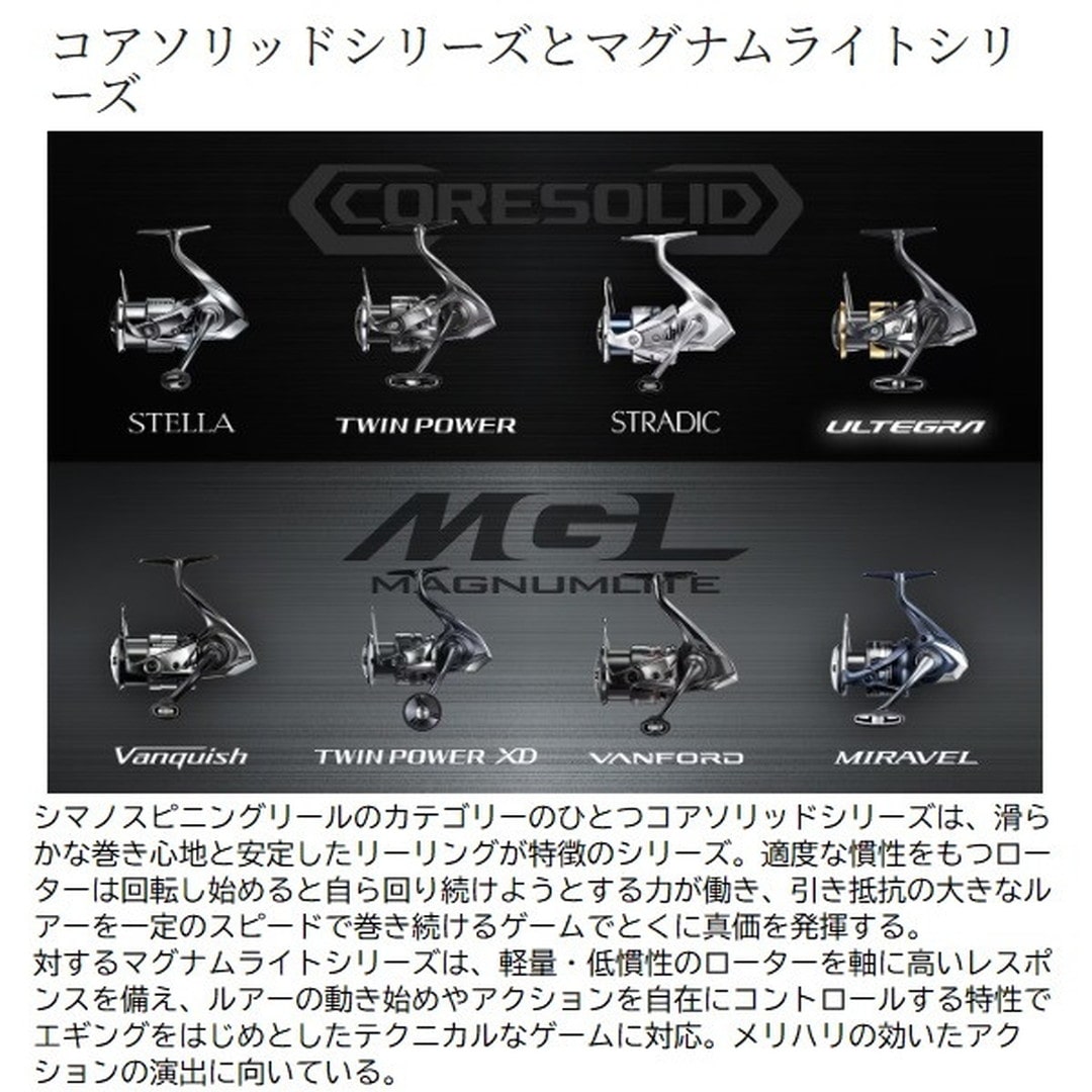 ULTIMATE EVOLUTION。価格帯の常識を超える回転性能と耐久性を装備し、多くのアングラーに人気のアルテグラ。より滑らかで安定した巻きを追求したコアソリッドシリーズの設計は、バイブレーションプラグなど引き抵抗の大きなルアーを一定速度で巻き続ける釣りにおいてとくにその真価を発揮。インフィニティクロス、インフィニティドライブ、アンチツイストフィンの追加でさらにレベルアップした基本性能は、エントリーユーザーはもちろんコアユーザーにも納得の使い勝手に仕上がっている。■2500SHG・・・2500Sハイギアモデル。バスから本流トラウトまで使える2500番サイズ系ハイギアスタンダード。手返し重視のバスフィッシング、流れの中でのルアー操作にすぐれたモデルで、バス、トラウト、エギング、ライトソルト、なんでもこなせる一台です。