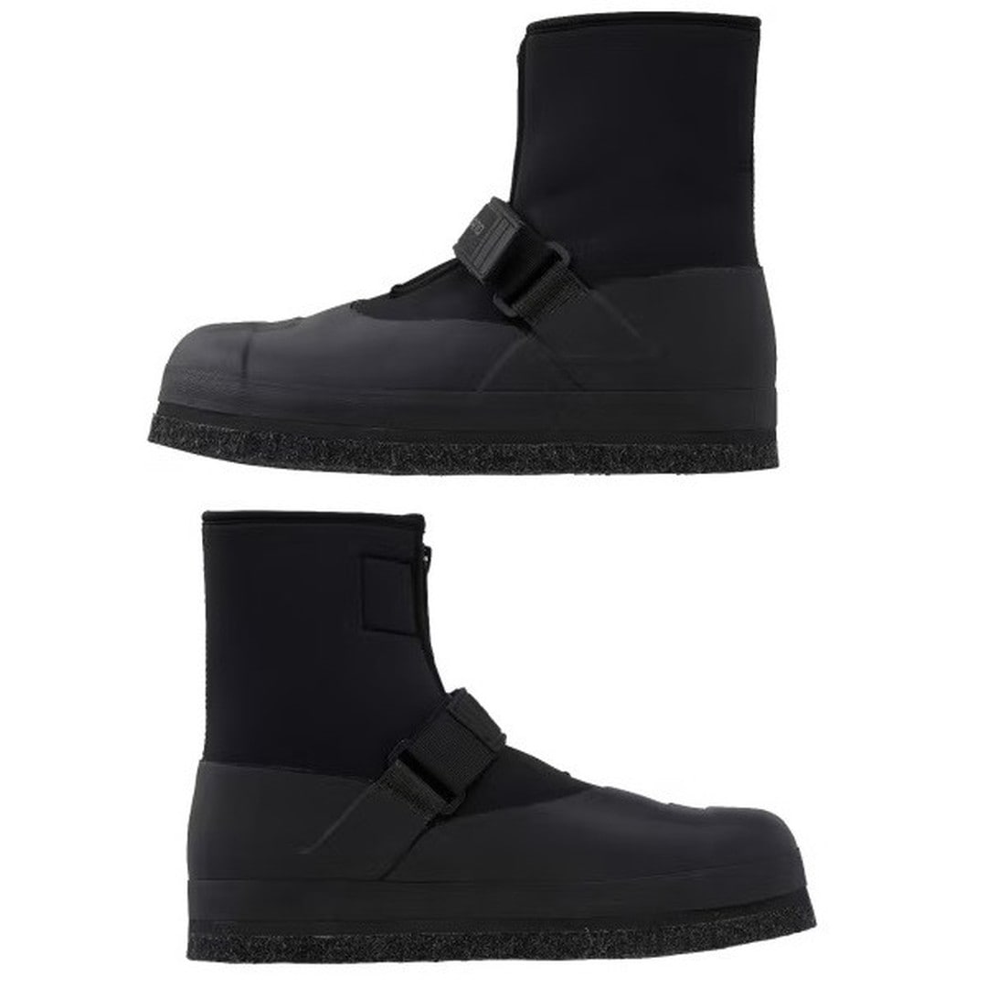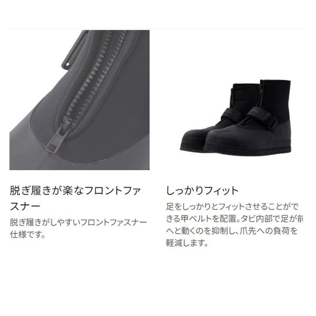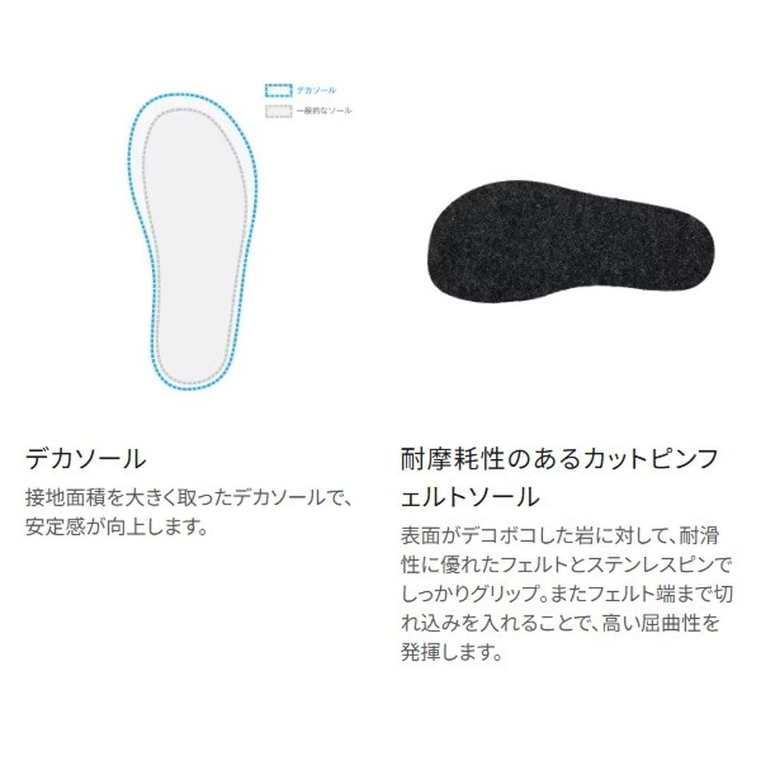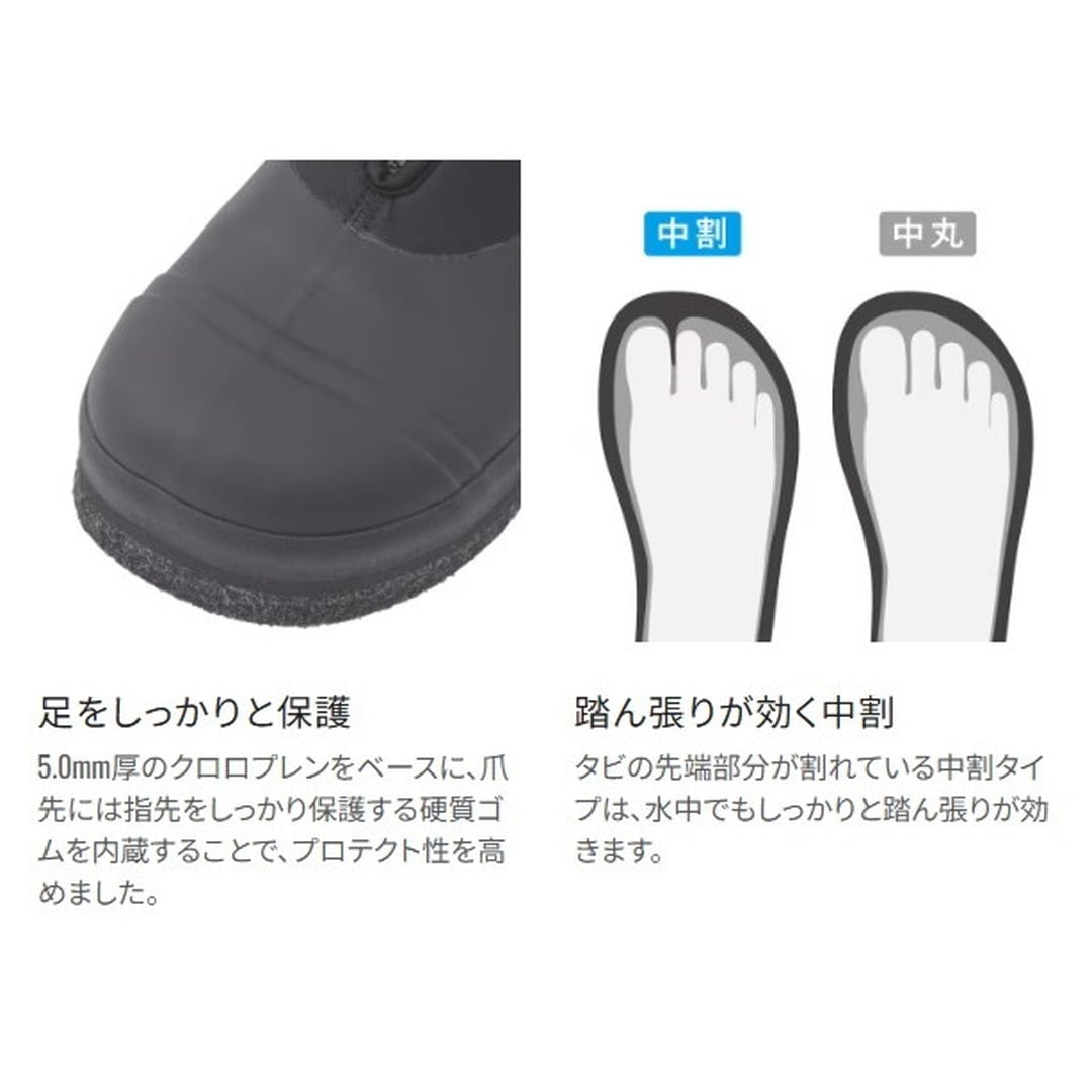 直付けソール鮎タビのスタンダードモデル。踏ん張りが効く中割れタイプで、ソールは石に食い込むピンフェルトを採用。5.0mm厚クロロプレンをベースに、指先部分には硬質ゴムを、そのほかの部分には保護性と運動性を考慮したゴムを貼り付けた鮎タビです。指先での踏ん張入りが効く中割れ、直付ソール、端まで切り込みが入ったカットピンフェルトが相まって、川底の石の感触を足裏で感じ取り、しっかりとしたグリップ力を得ることができます。またデカソールの採用により安定感もアップしています。排水は、砂利やゴミが入りづらい足裏からの排水構造です。