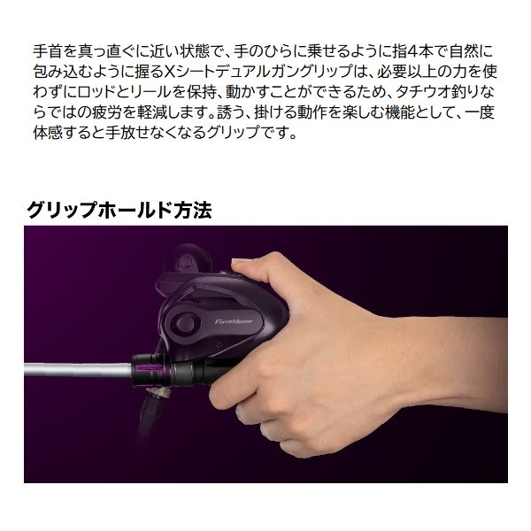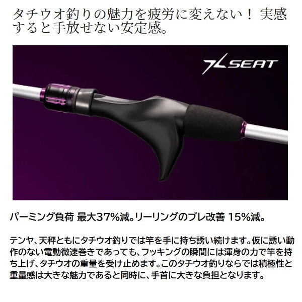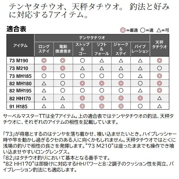 に今や全国区の人気ターゲットであるタチウオ。釣法の多様化、地域の広がりはタックルが細分化し、適した竿が分かりにくくなりかねないもの。そこでシマノは最先端のタチウオシーンで必要とされている要素を適材適所に採用、実戦向きのコストパフォーマンスに優れるロッド、サーベルマスターTTを開発。■73 M210・・・喰わせ7:3調子。タチウオの小さなアタリを目感度で大きく表現。電動巻き誘いにおいてタチウオのアタリを弾かずに喰い込ませる7:3調子アイテムです。