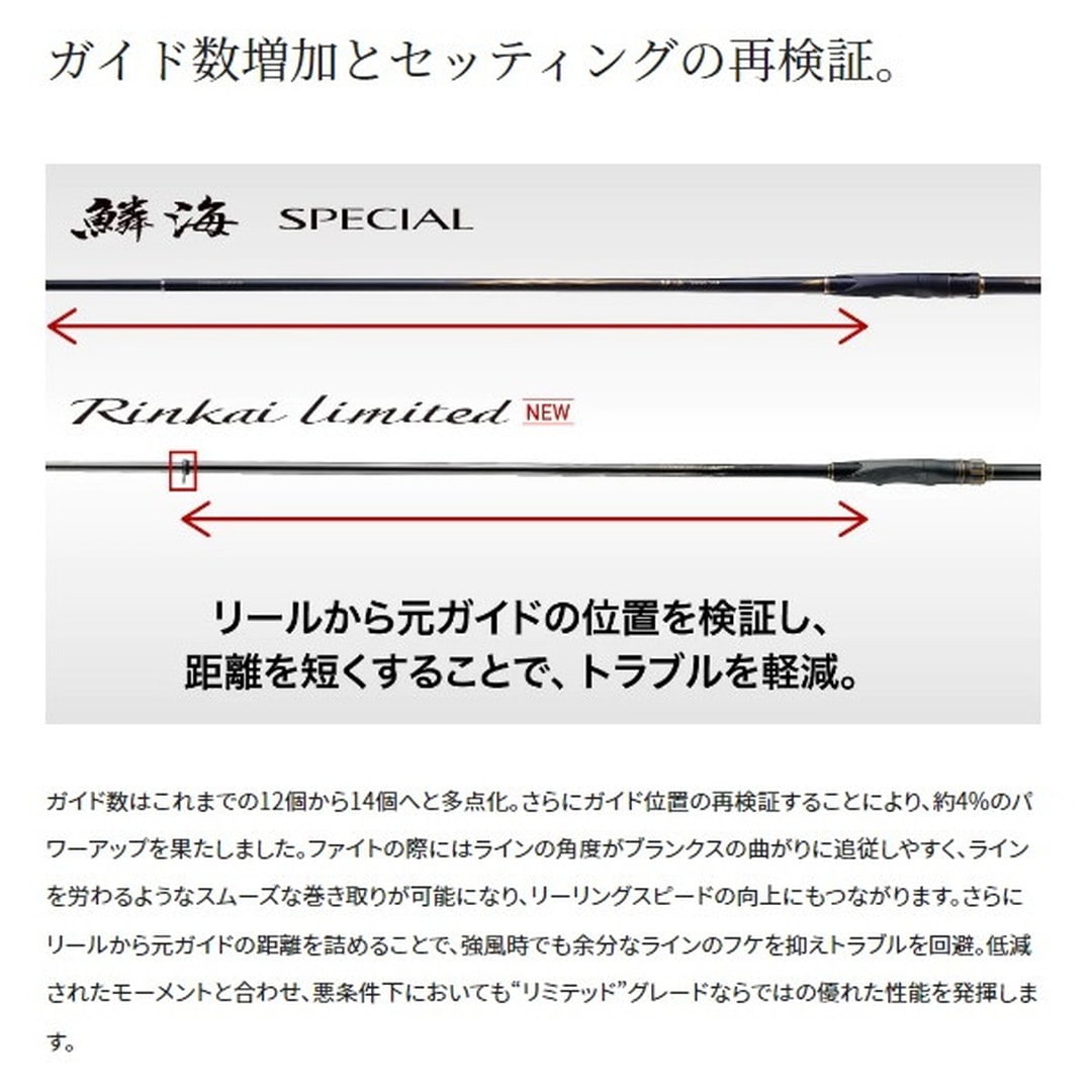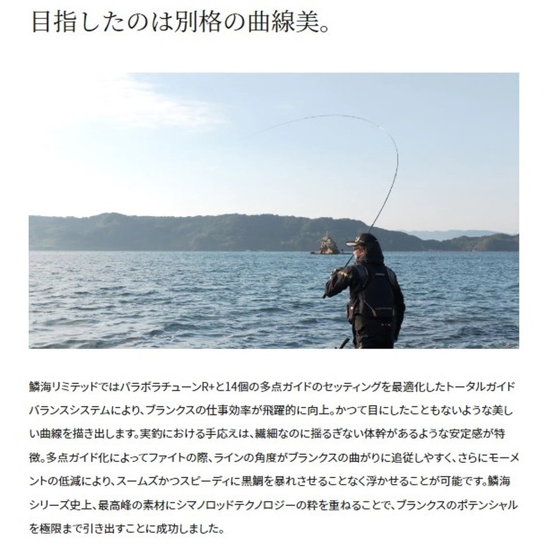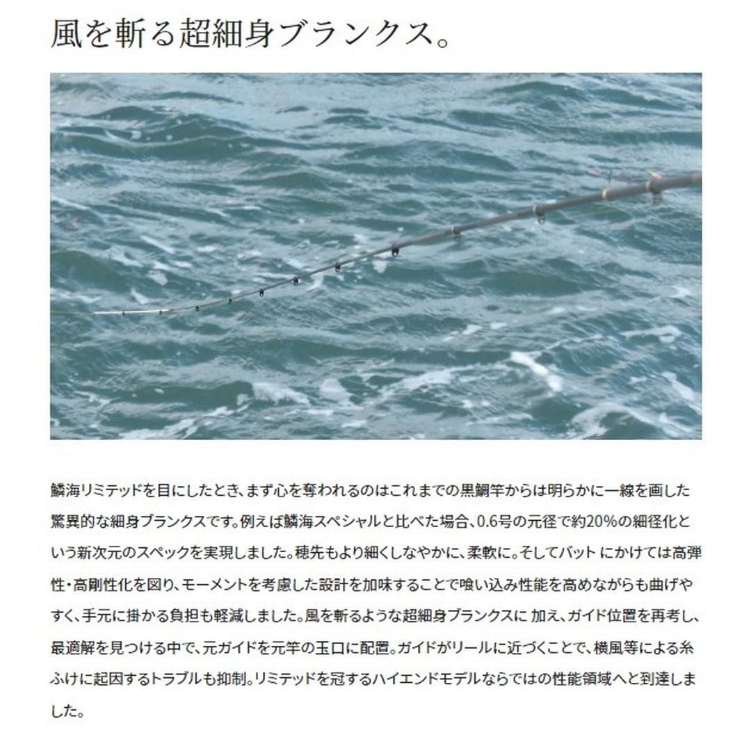 シマノが誇る鱗海ブランドの最高峰として陶然とさせる曲線の美しさを追求した「Rinkai limited」。銀鱗を纏ったかのような細く、強靭で凛としたブランクスには高性能カーボンとネジレの抑制を徹底追及したスパイラルXコアを採用。躍動する曲がりを滑らかな調子に寄与するパラボラチューンR+で表現。この竿は使い手の技量をより美しいものに、より官能的なものへと深化させる。■06-530・・・鱗海調子独特の操作性と、チヌを暴れさせない調子を両立したモデル。持ち重り軽減を徹底追求した細身ブランクスにより一日を通した正確なロッドワークをサポート。曲げ込むほどに発揮するロッドの粘りが魚を暴れさせず流麗なやり取りを実現。