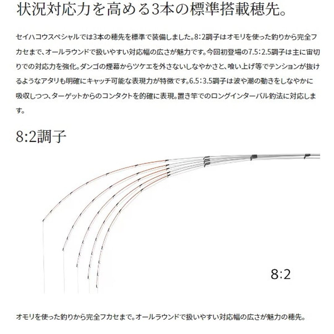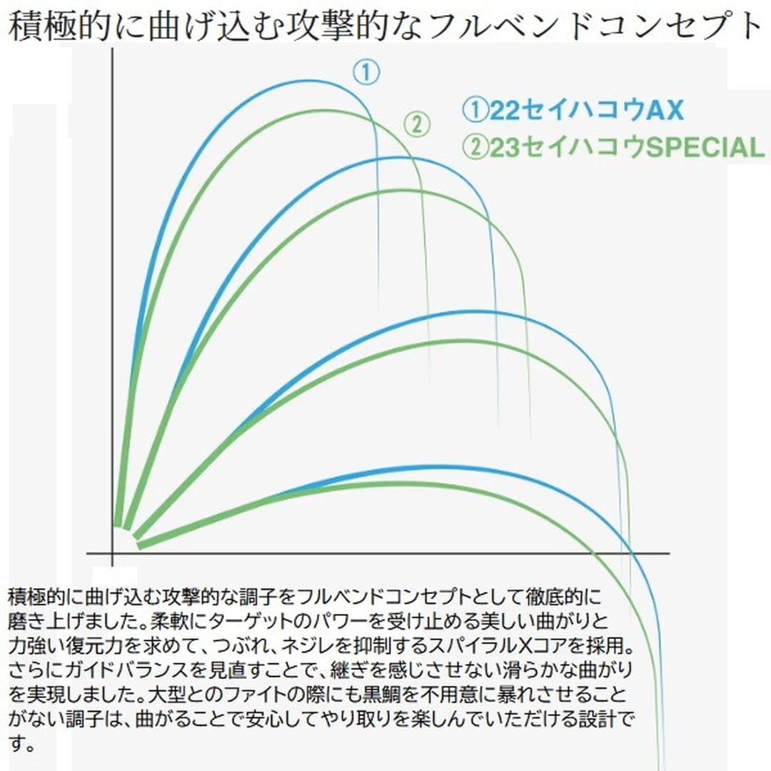 曲げ切り、浮かせる。フルベンドコンセプト。セイハコウスペシャルは積極的に曲げ込む攻撃的な調子をフルベンドコンセプトとして徹底的に磨き上げました。●150/145・・・操作性に優れた攻めのショートモデル。軽量で操作性に優れているため、手返しの速い数釣りや、足元の釣り、海面までの距離が短い釣座に適したモデルです。